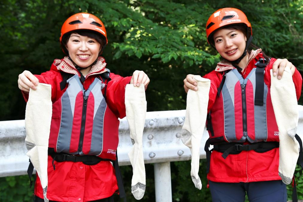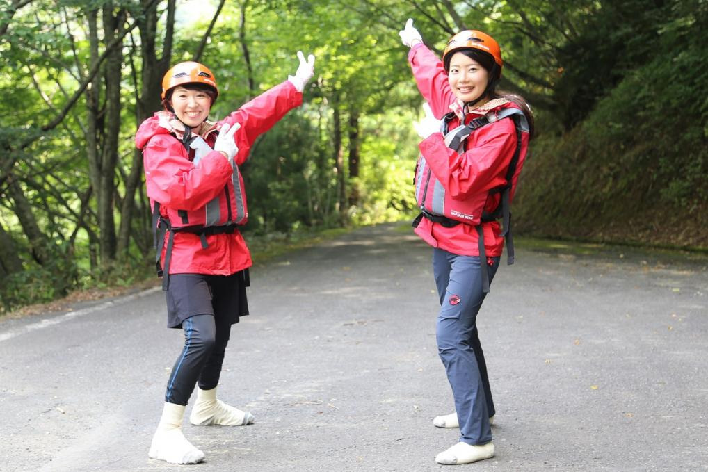 ツアーの説明を受けた後、ヘルメット・カッパ・ライフジャケット・軍手・軍足を身にまとい、いざ冒険に出発です!