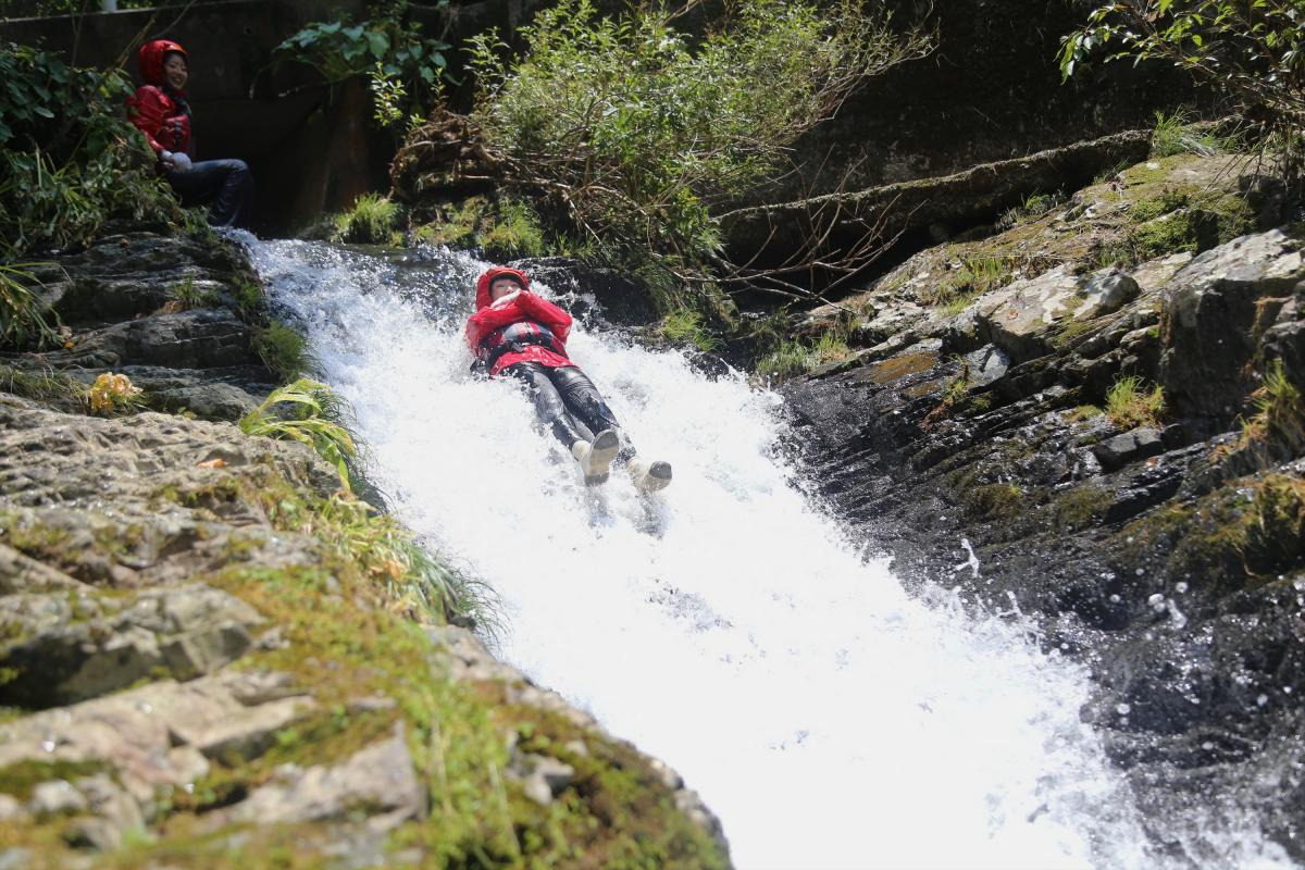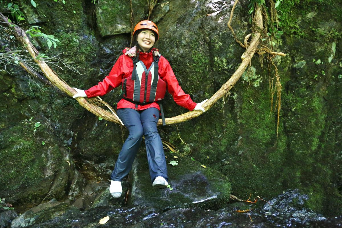 森へ抜け、道を上がっていくと、いよいよ冒険も終了。滝行あり、急な流れを上る道あり、岩場あり、流れる滝に身を任せるすべり台やジャングルありの、ワクワクしつつも険しい道でしたが、金山さんのガイドと軍足などの装備のおかげで怪我なく安全に帰ってこられました。日常のストレスをすべて発散し、森や滝から大きなパワーをもらえました! 童心に返って楽しみながら身も心も逞しくなる旅へ、ぜひお出掛けください。