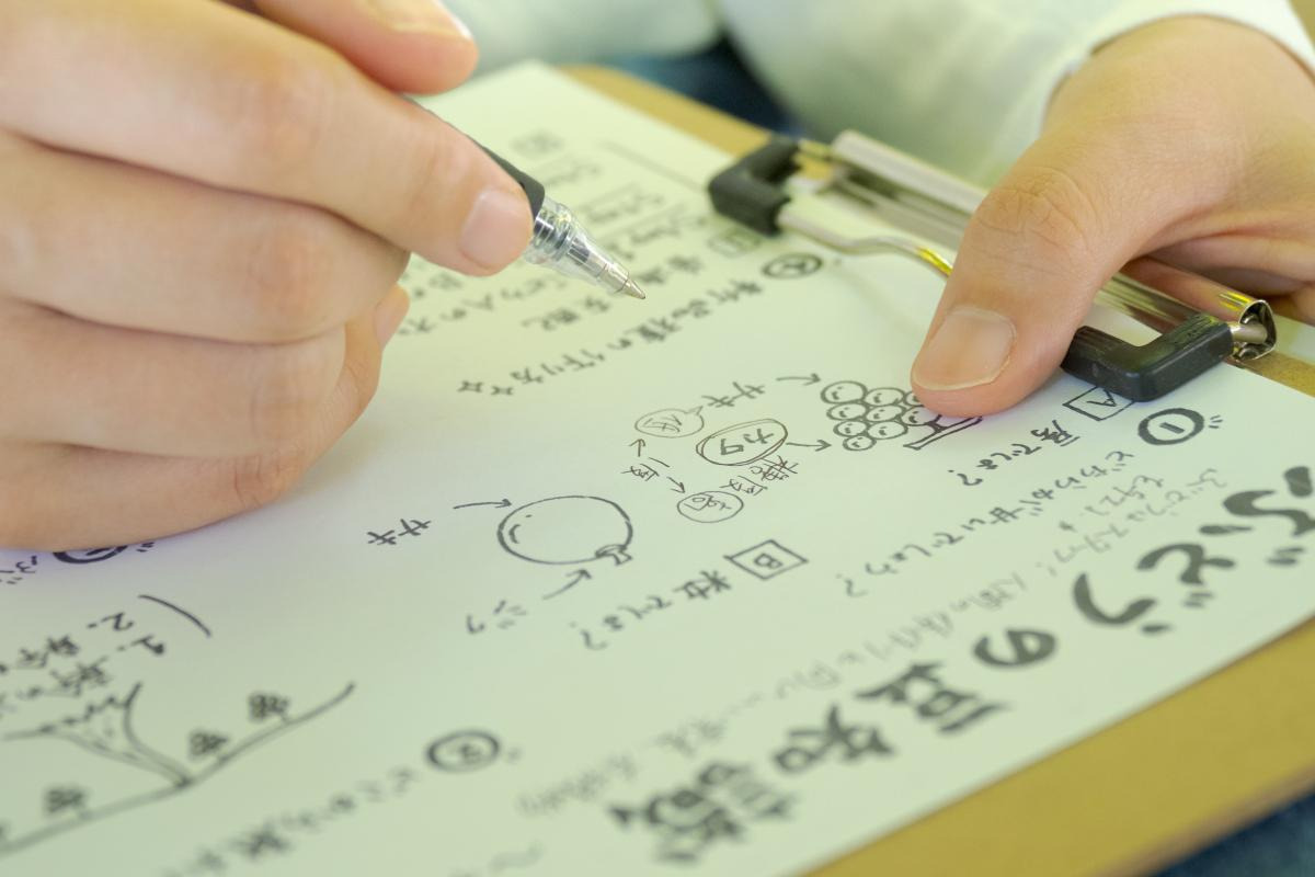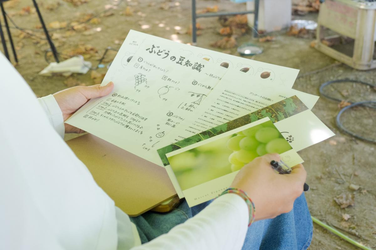 体験のスタートは、ぶどうが栽培されているハウスで行われる、食べ比べを交えたぶどう講座!ぶどうのポストカードやカラフルなパンフレット、約50種類ものぶどうが掲載された研究所のぶどう一覧、書き込み式ワークシートなど、ワクワクする資料が配られます。