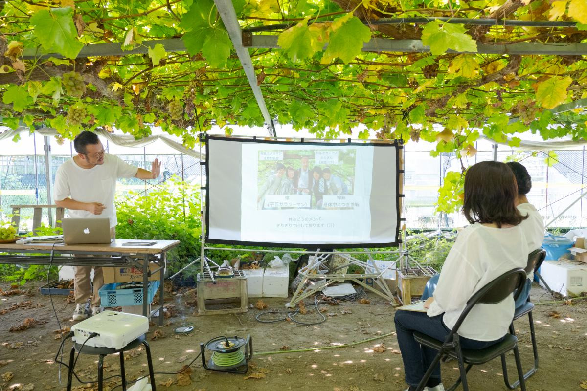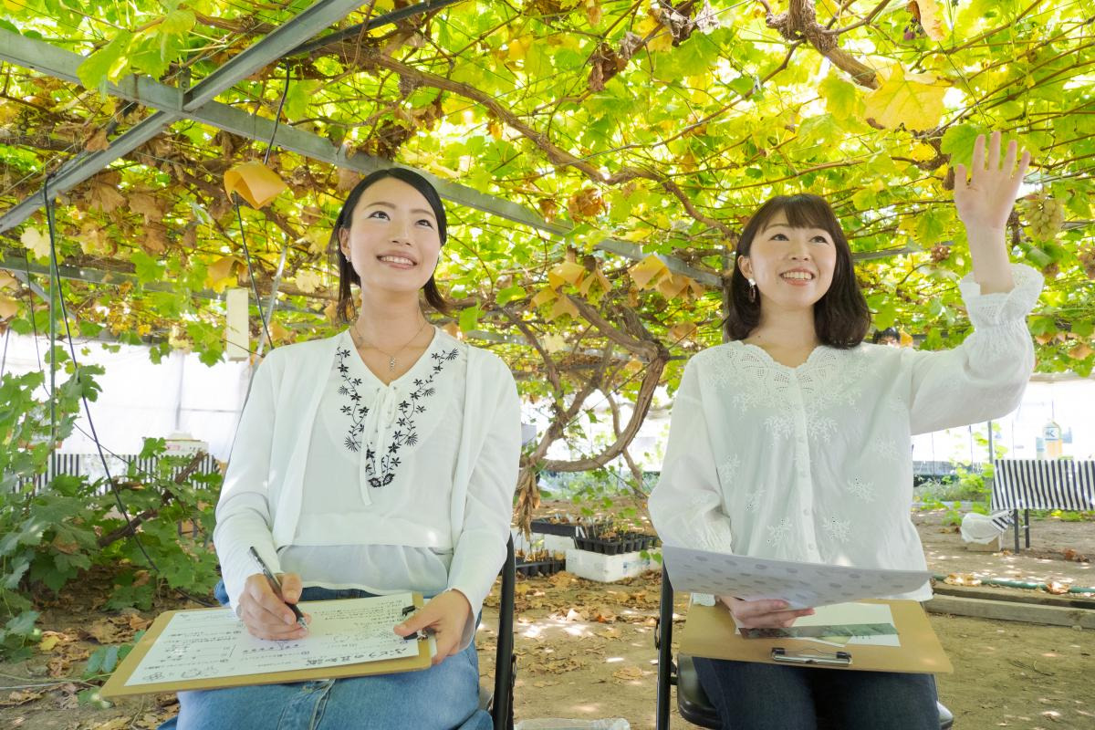 ぶどうハウスの中で、ワクワク楽しい「ぶどう講座」スタート!