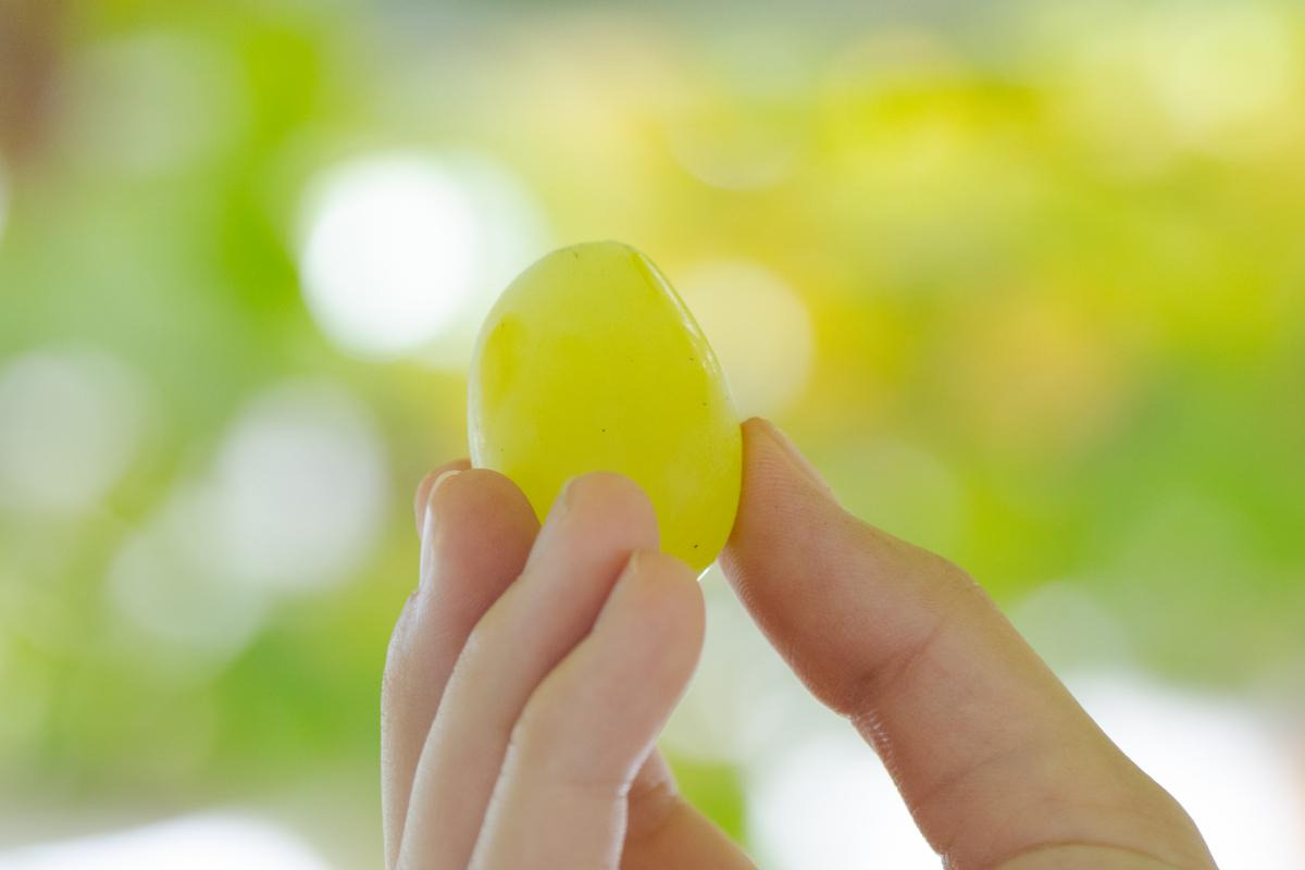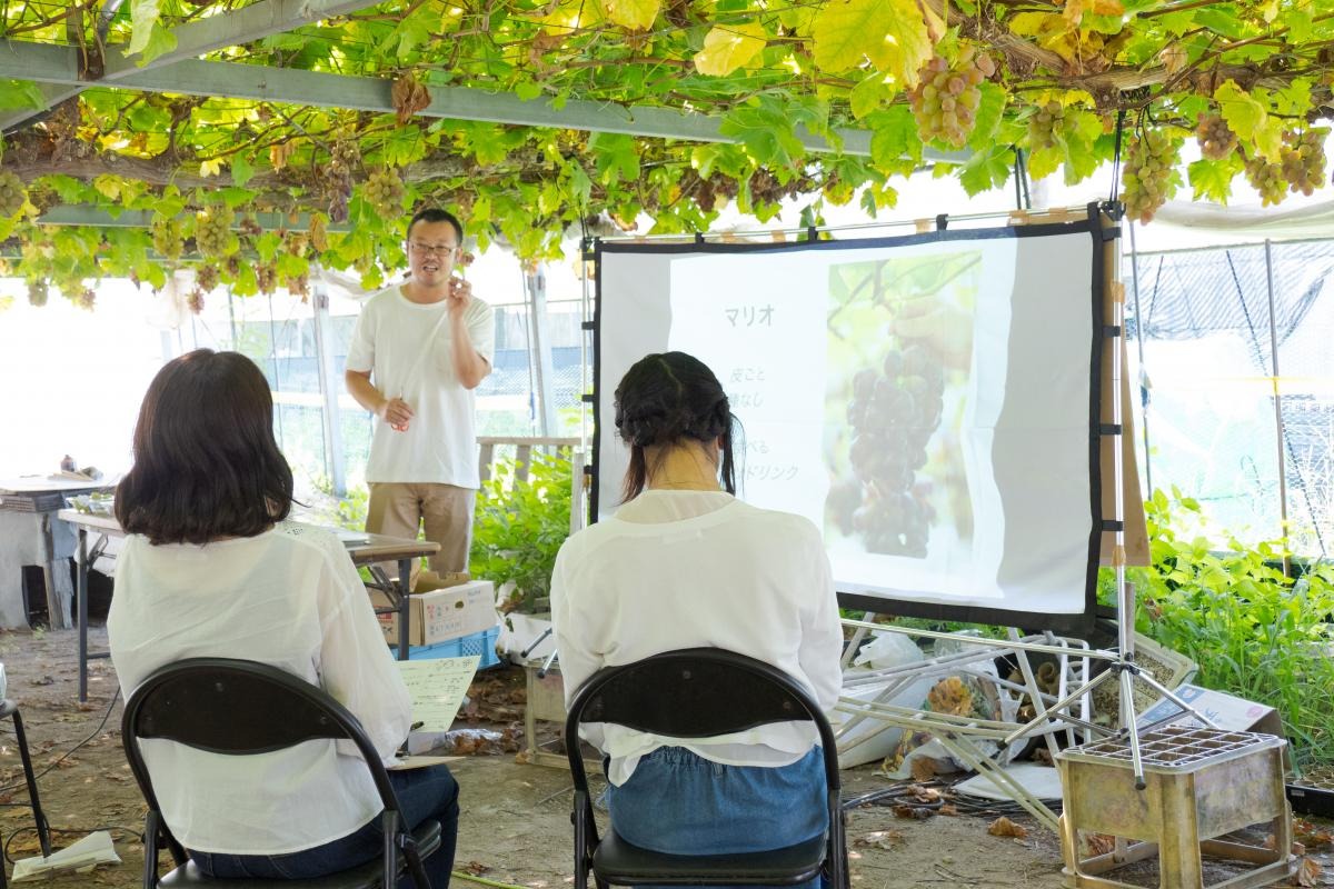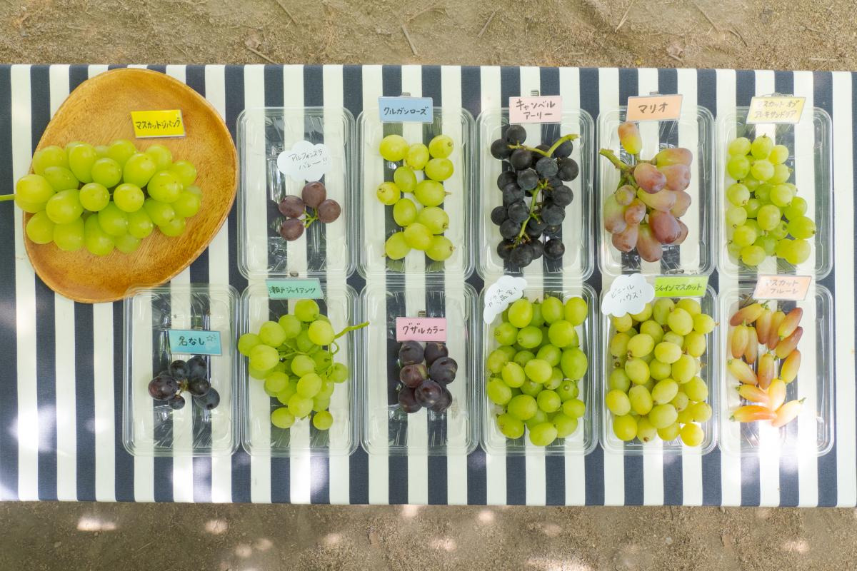 次々に豆知識講座は進み、熟れる順序やぶどうの種類などの基礎知識編に。ぶどう素人である私たちの質問にも、林さんは丁寧に答えてくれます。講座の合間に出されるぶどうの品種もさまざま。果汁が溢れ出るジューシーな「マリオ」、厚みのある皮からは想像できない甘みの「クルガンローズ」、細長くフルーティーな「マスカットフルーレ」…名前もキュートなぶどうに、舌も心もメロメロに。