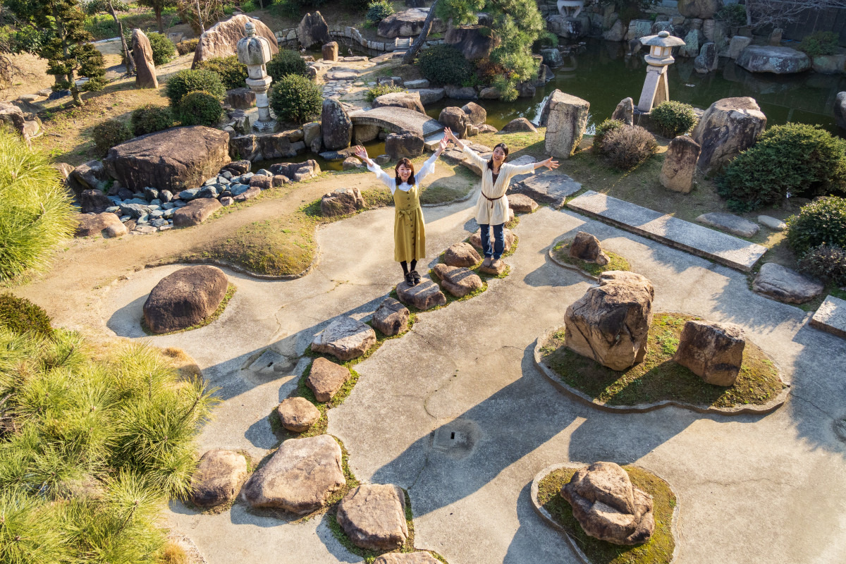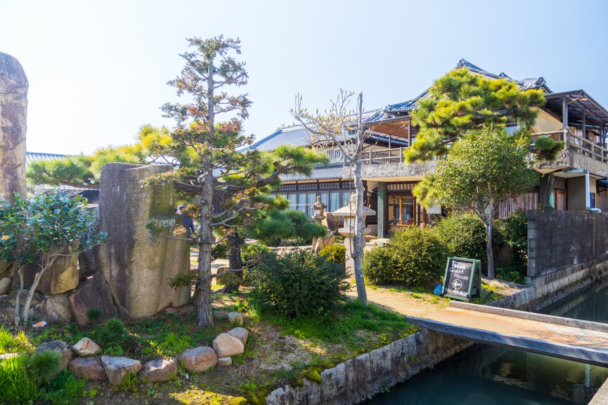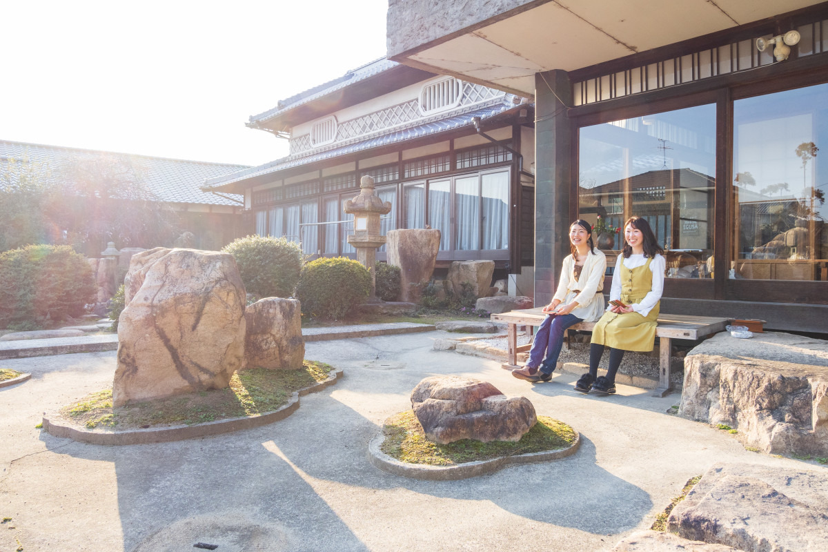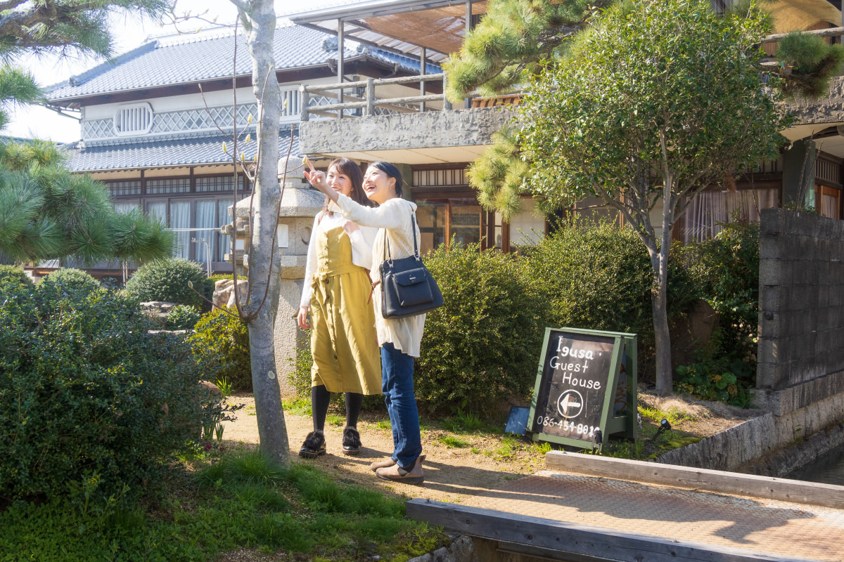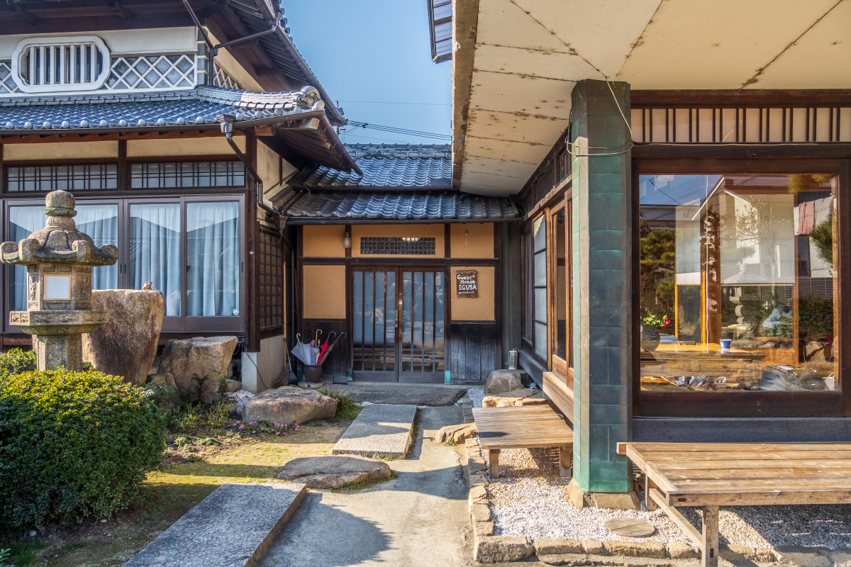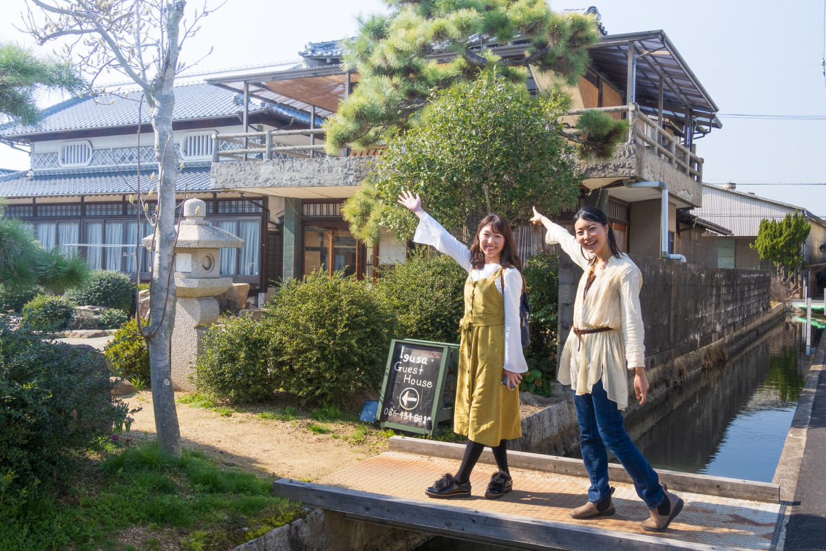 まずは、体験場所の「岡山ゲストハウスいぐさ」へ! JR岡山駅から快速電車で約10分のJR早島駅で下車し、閑静な住宅街を歩くこと約5分。突如、芸術的で壮麗な日本庭園と古民家が現れます。突然の美しい景観に、一瞬でタイムスリップしてしまったかのような不思議な感覚に包まれつつ、日本古来の絶妙なバランスの様式美にうっとりしてしまいます。