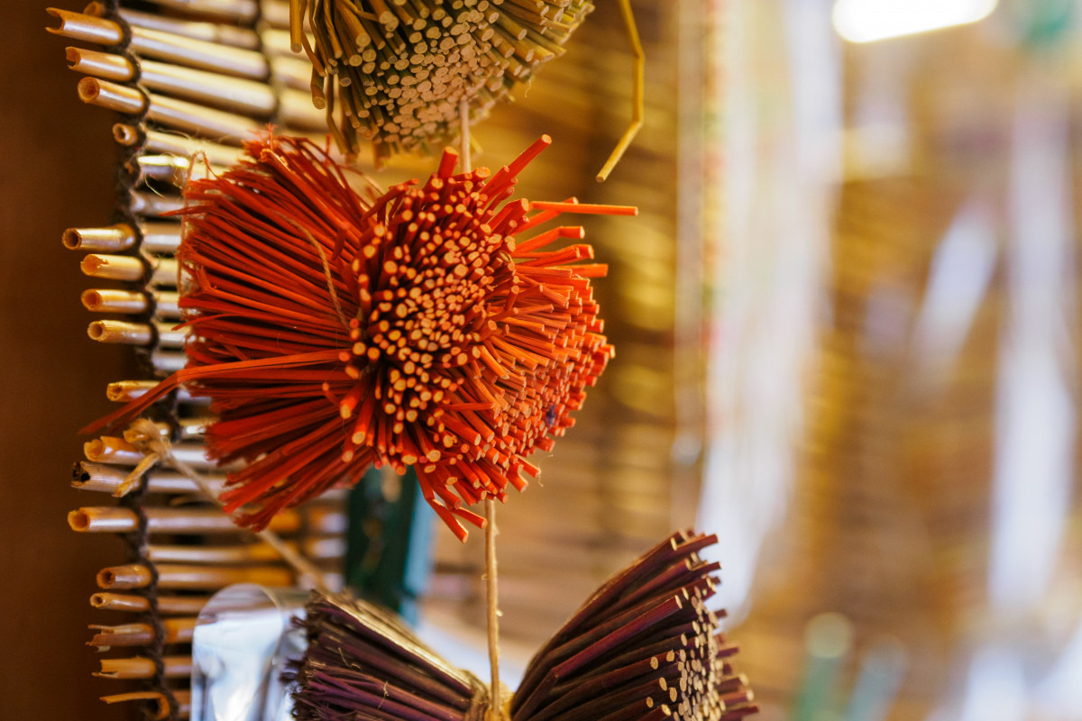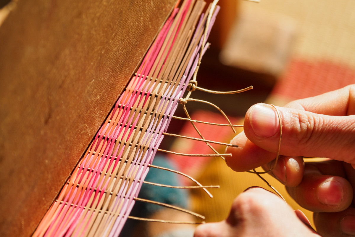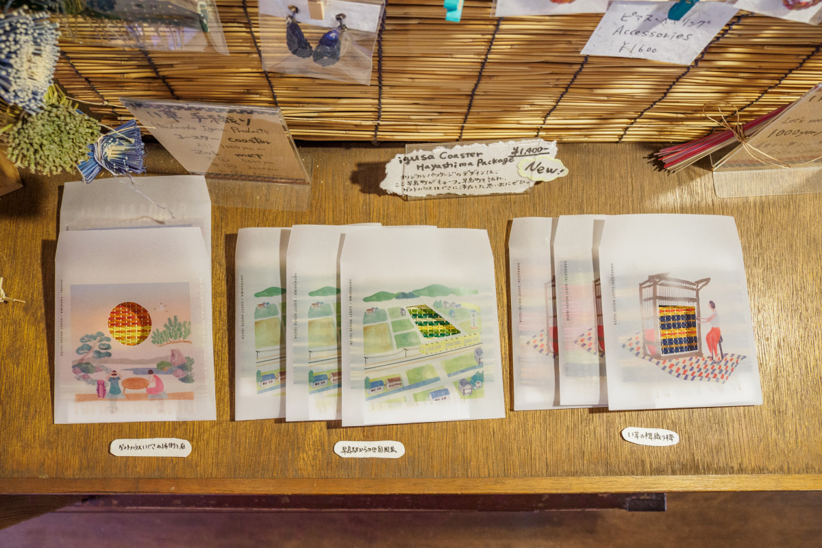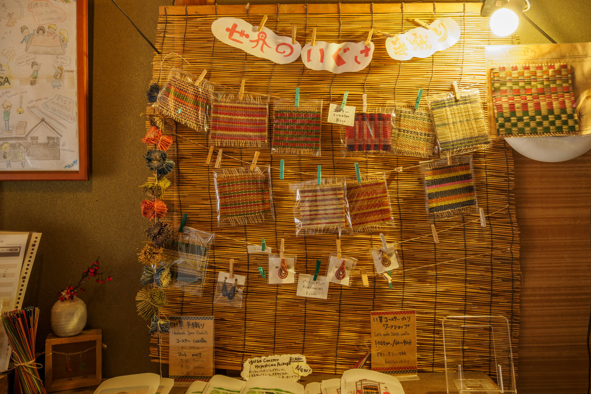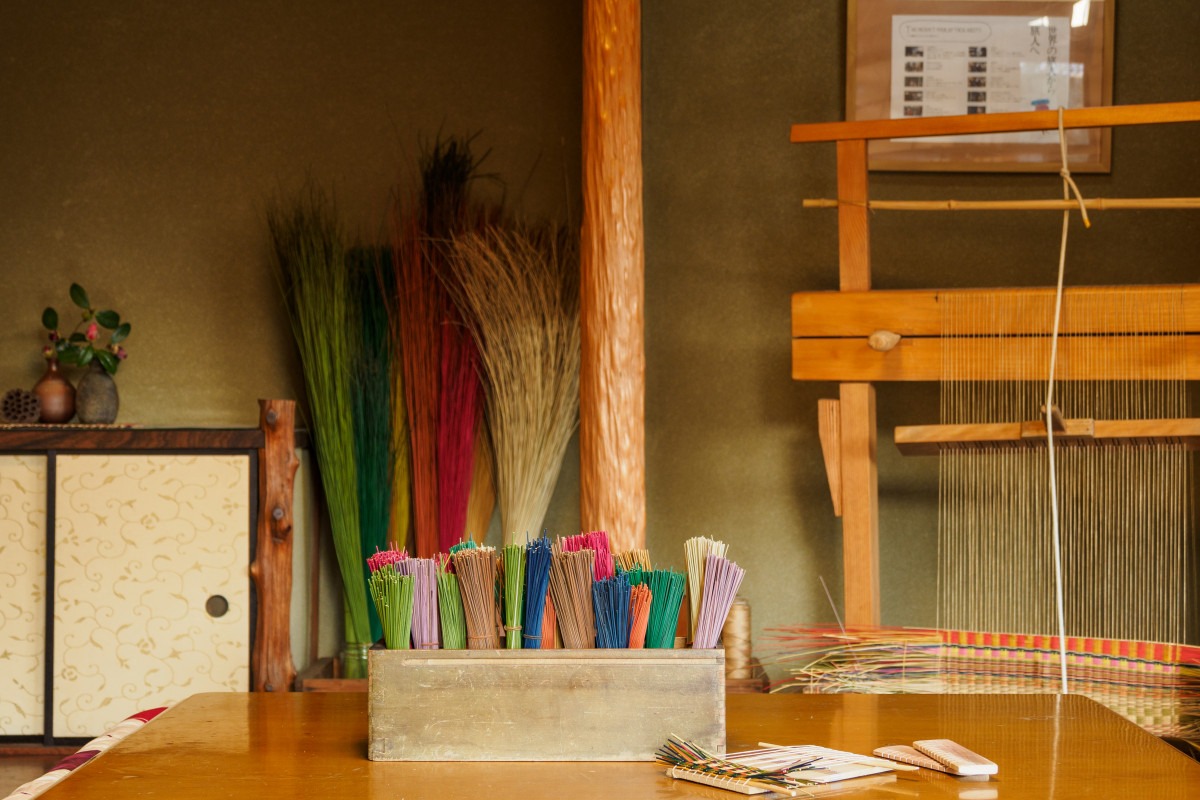 かつては、い草の生産が有名だった岡山。しかし、時代の流れで生産者が減少。地元の文化を守るため、ゲストハウスいぐさではい草を育てるプロジェクトも行っています。い草は、自然の産物そのもの。他の素材に比べて個々の違いが出やすく、細さも硬さも色合いも、ものによって異なります。選んだい草を、一本ずつ織り機に通すたびに「世界に一本しかない素材」という意識が生まれ、愛おしさが込み上げます。
