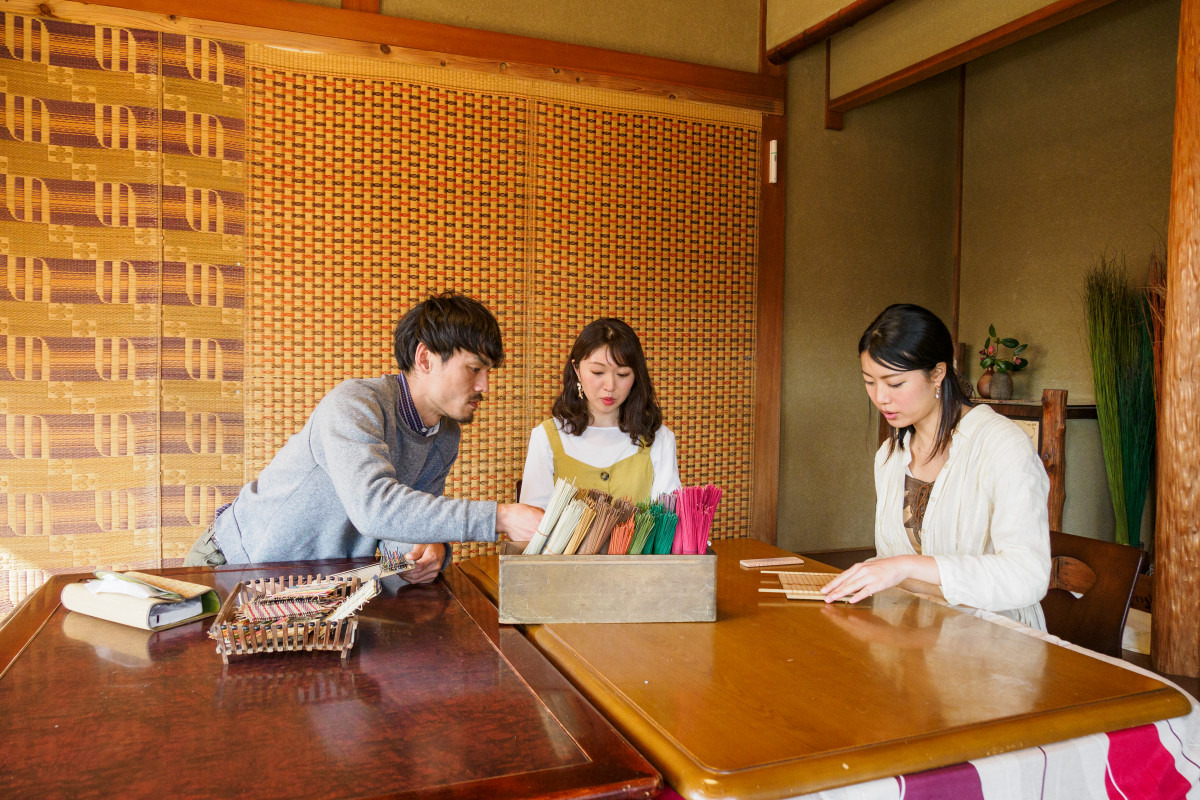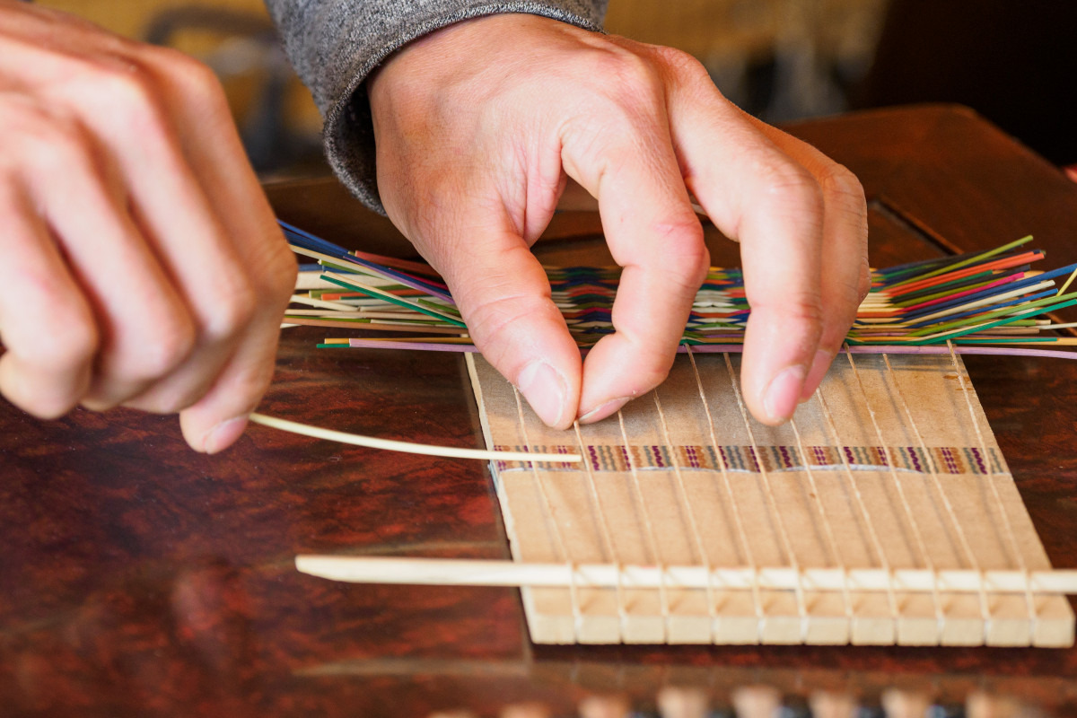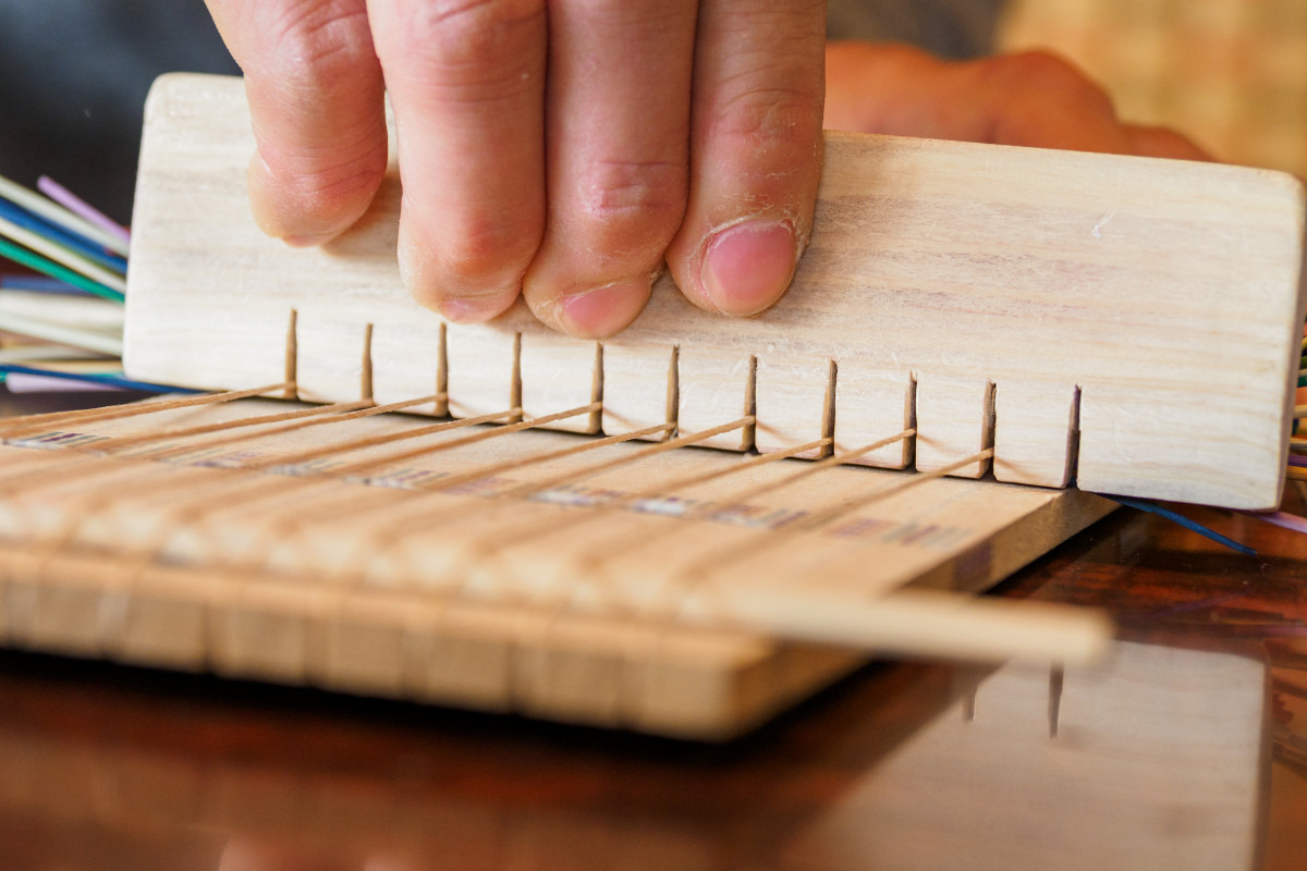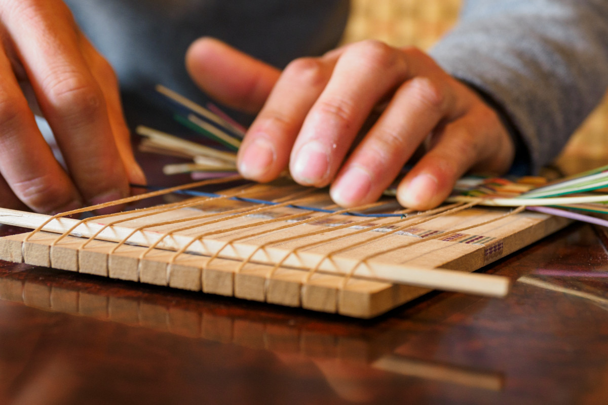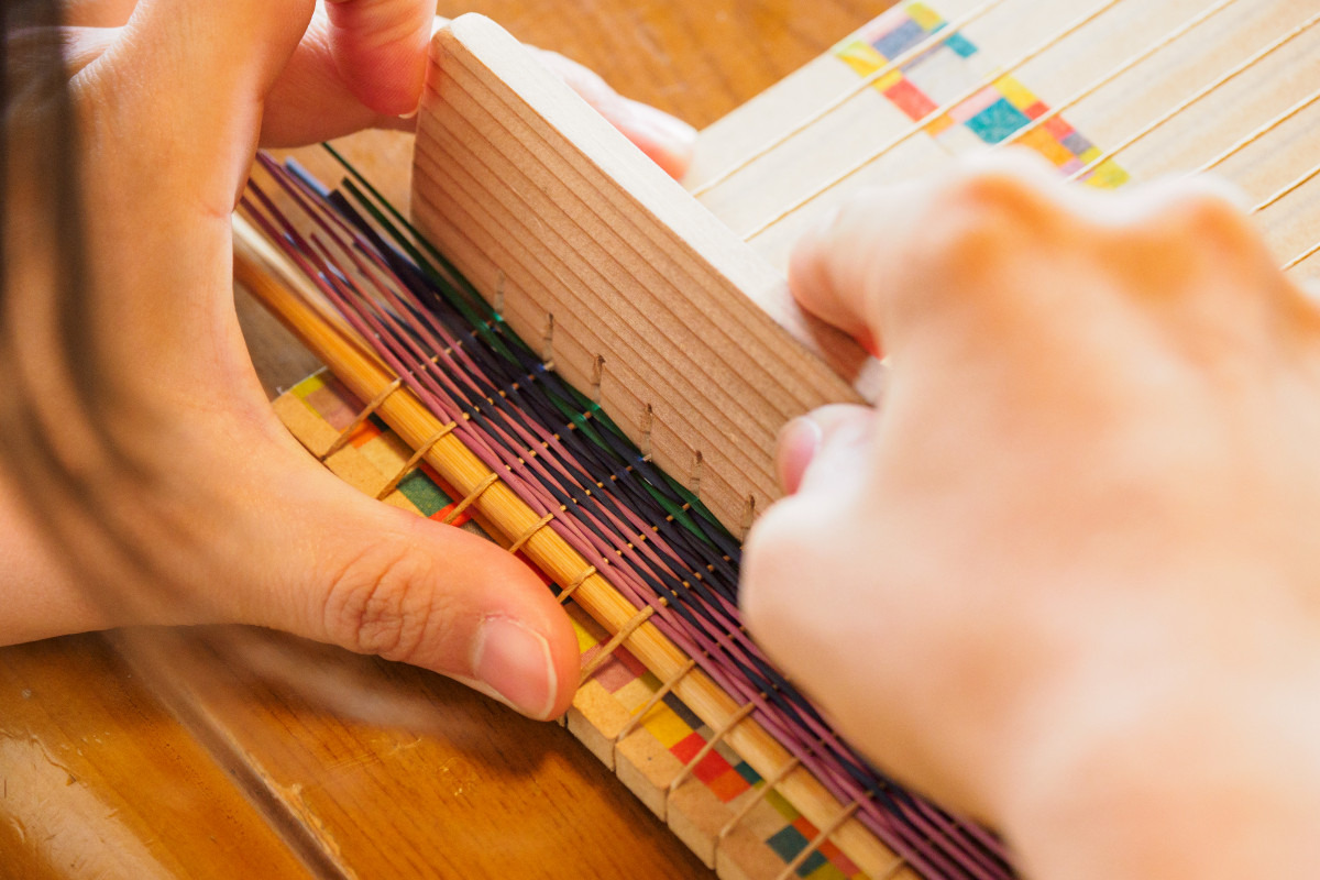 いよいよ、コースター作り開始。体験は、宿泊者じゃなくても大丈夫! 1人1つずつ、縦に9本の糸が張られた木製枠型のミニ織り機を手にしたら、スタッフさんによるレクチャーがスタート! まずは織り機を机に置き、好きな色のい草を手に取ります。い草を横向きに持ち、織り機の糸の間を、上下交互に端まで通します。終わったら織り機を立て、櫛で梳くようにい草を下方に詰めます。次のい草は前のものと逆の通し方をして、終わったら前のい草の上に櫛で詰めます。この繰り返しでコースターを作っていきます。