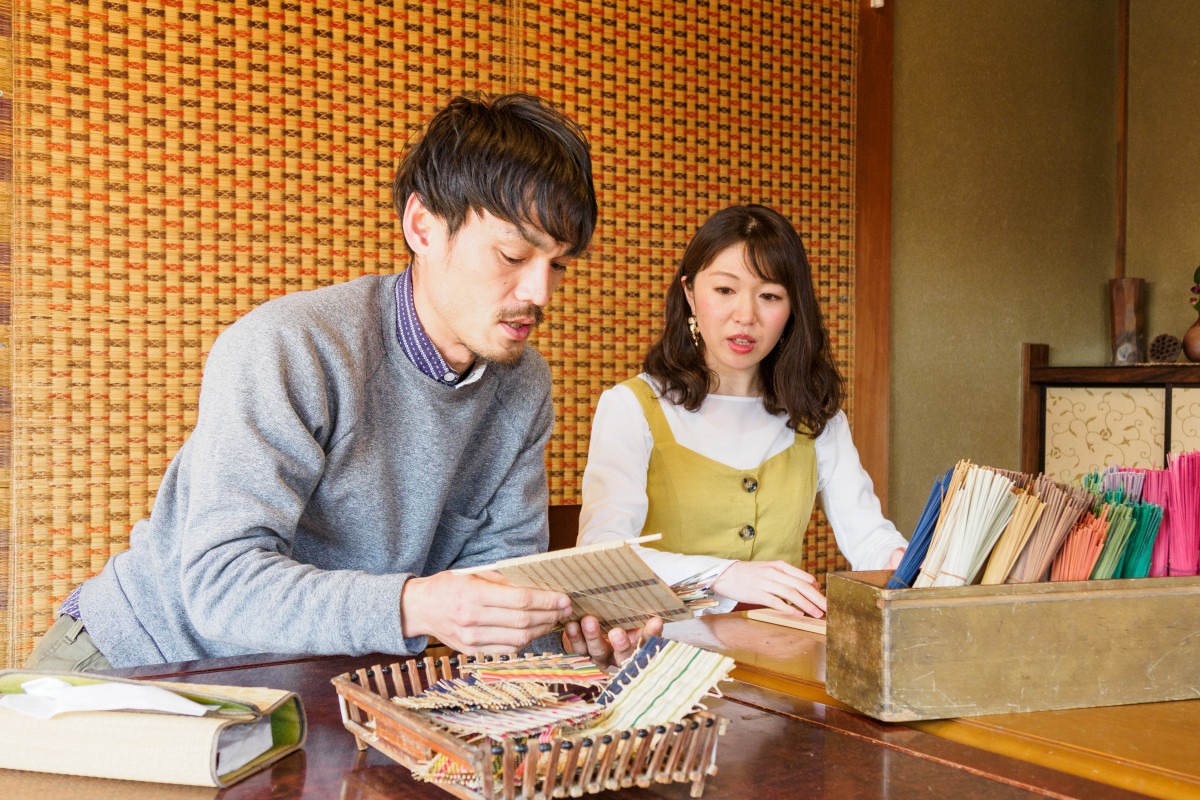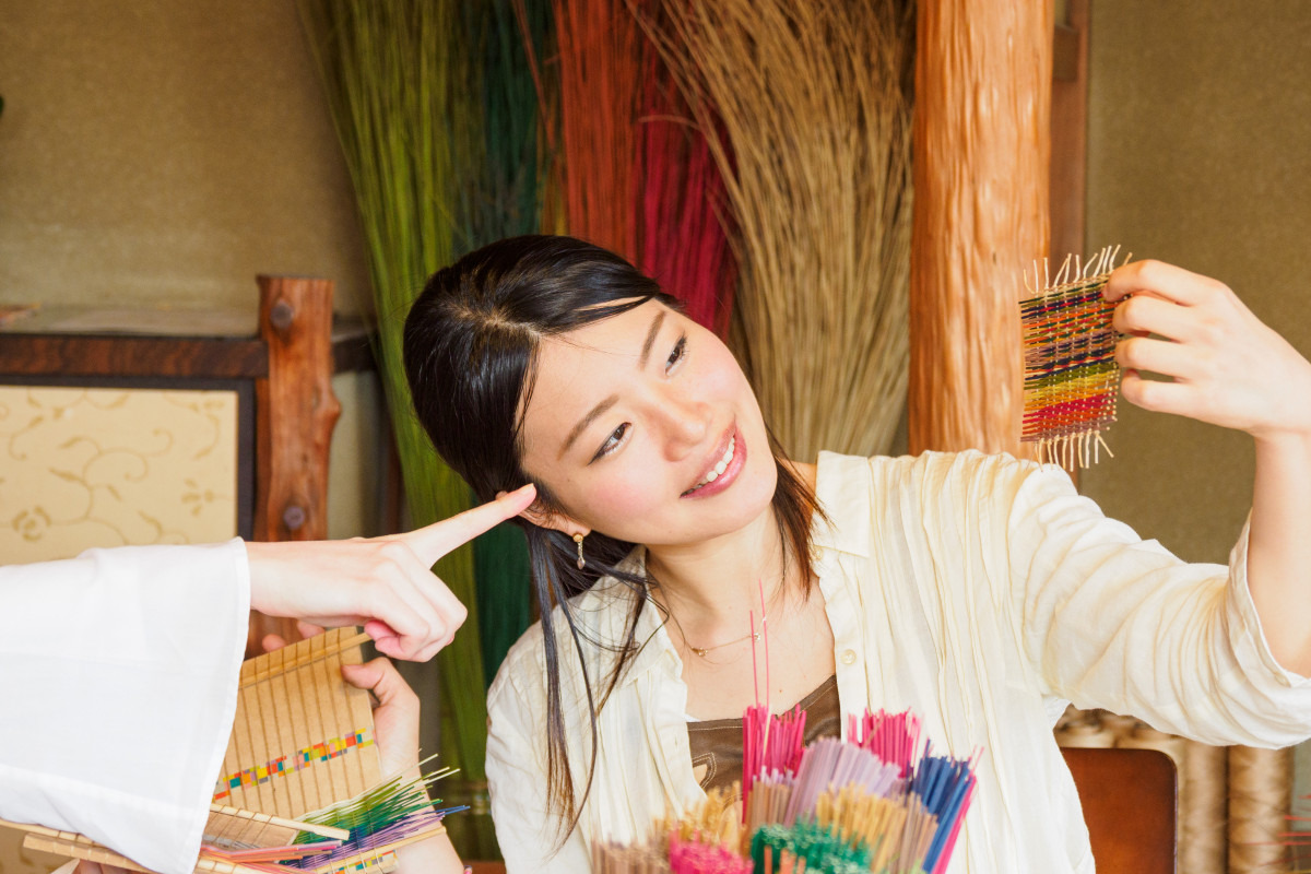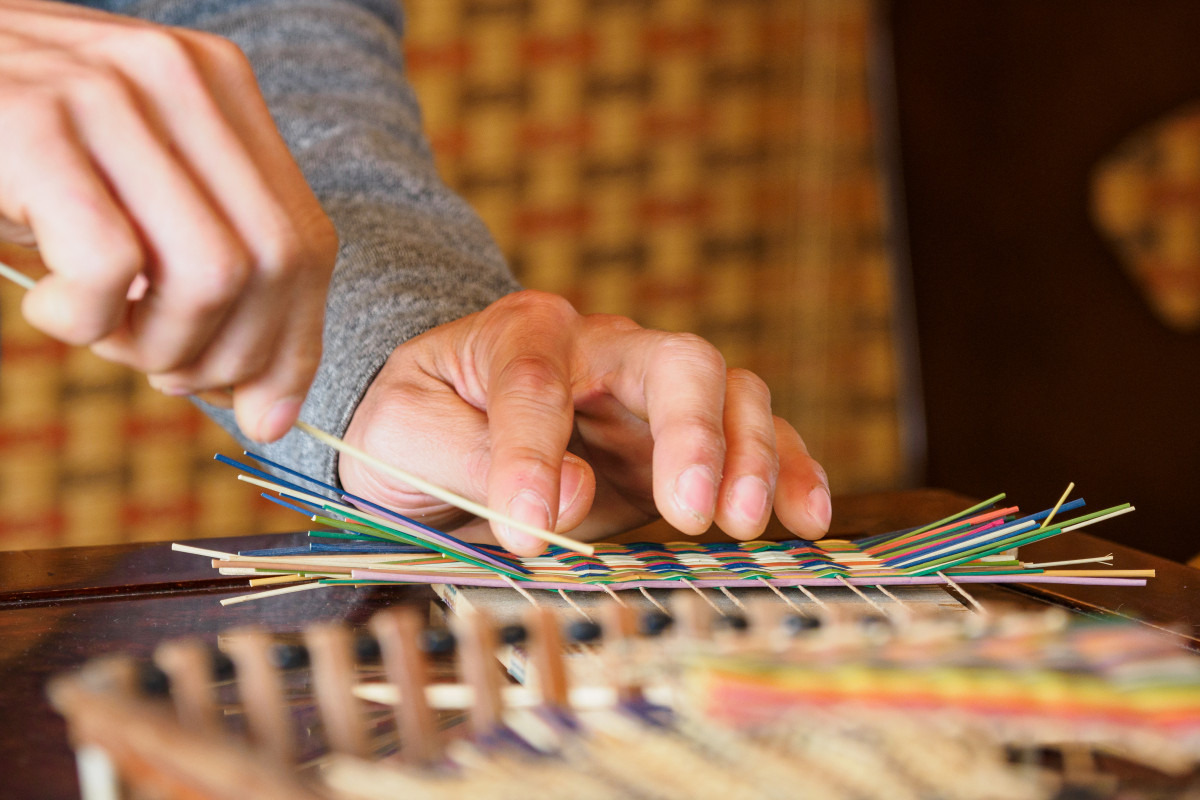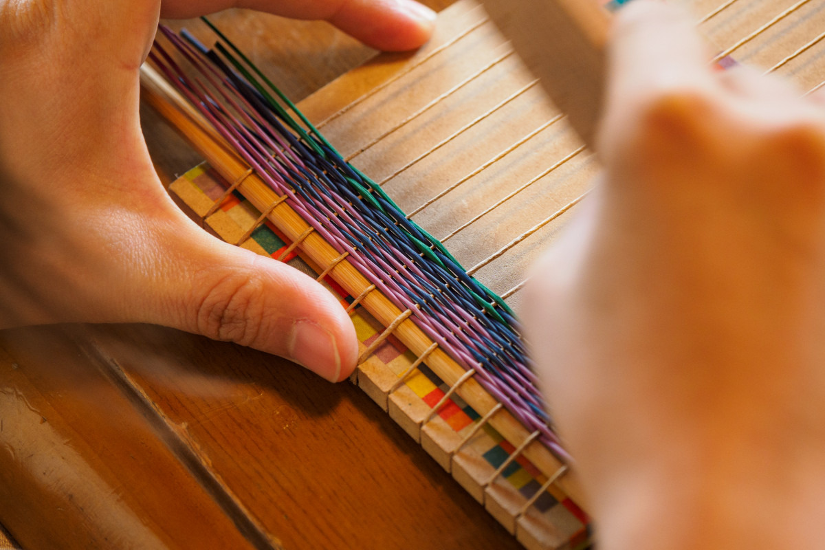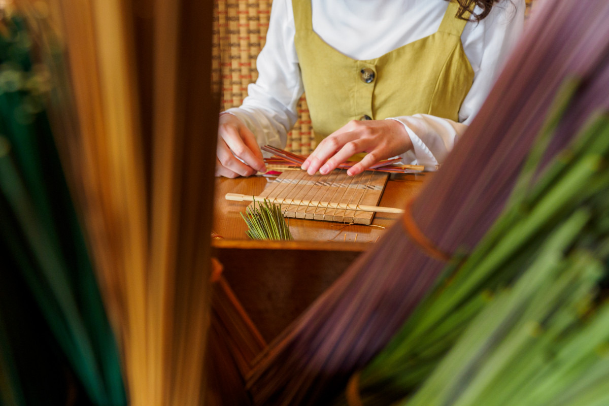 いよいよ、コースター作り開始。体験は、宿泊者じゃなくても大丈夫! 1人1つずつ、縦に9本の糸が張られた木製枠型のミニ織り機を手にしたら、スタッフさんによるレクチャーがスタート! まずは織り機を机に置き、好きな色のい草を手に取ります。い草を横向きに持ち、織り機の糸の間を、上下交互に端まで通します。終わったら織り機を立て、櫛で梳くようにい草を下方に詰めます。次のい草は前のものと逆の通し方をして、終わったら前のい草の上に櫛で詰めます。この繰り返しでコースターを作っていきます。