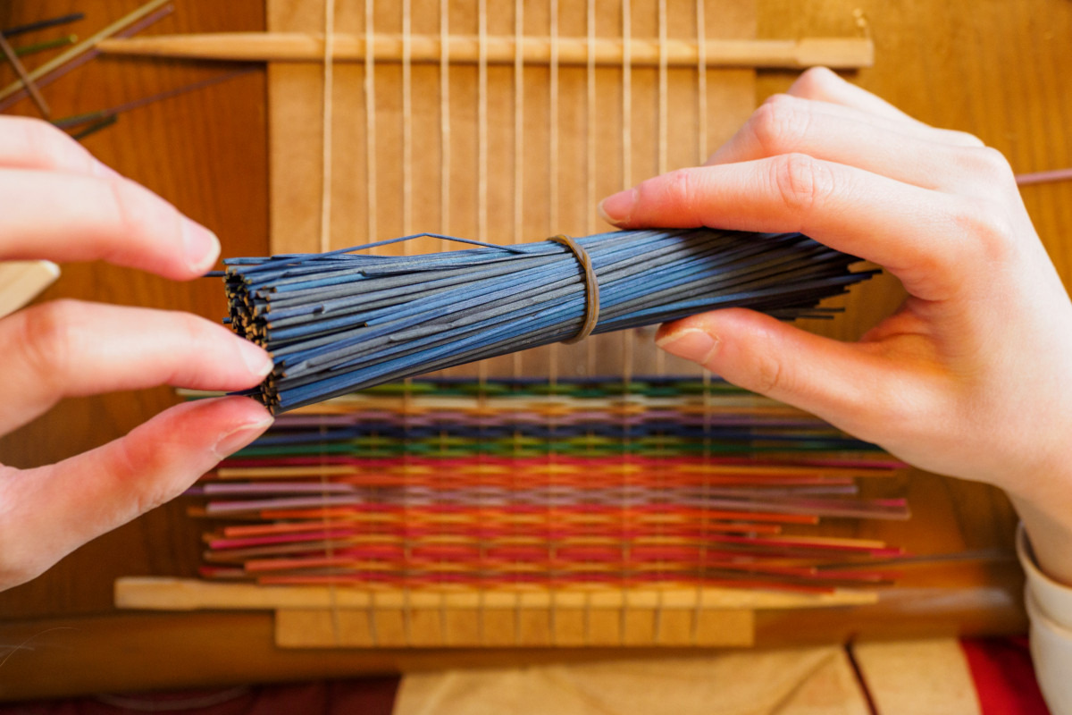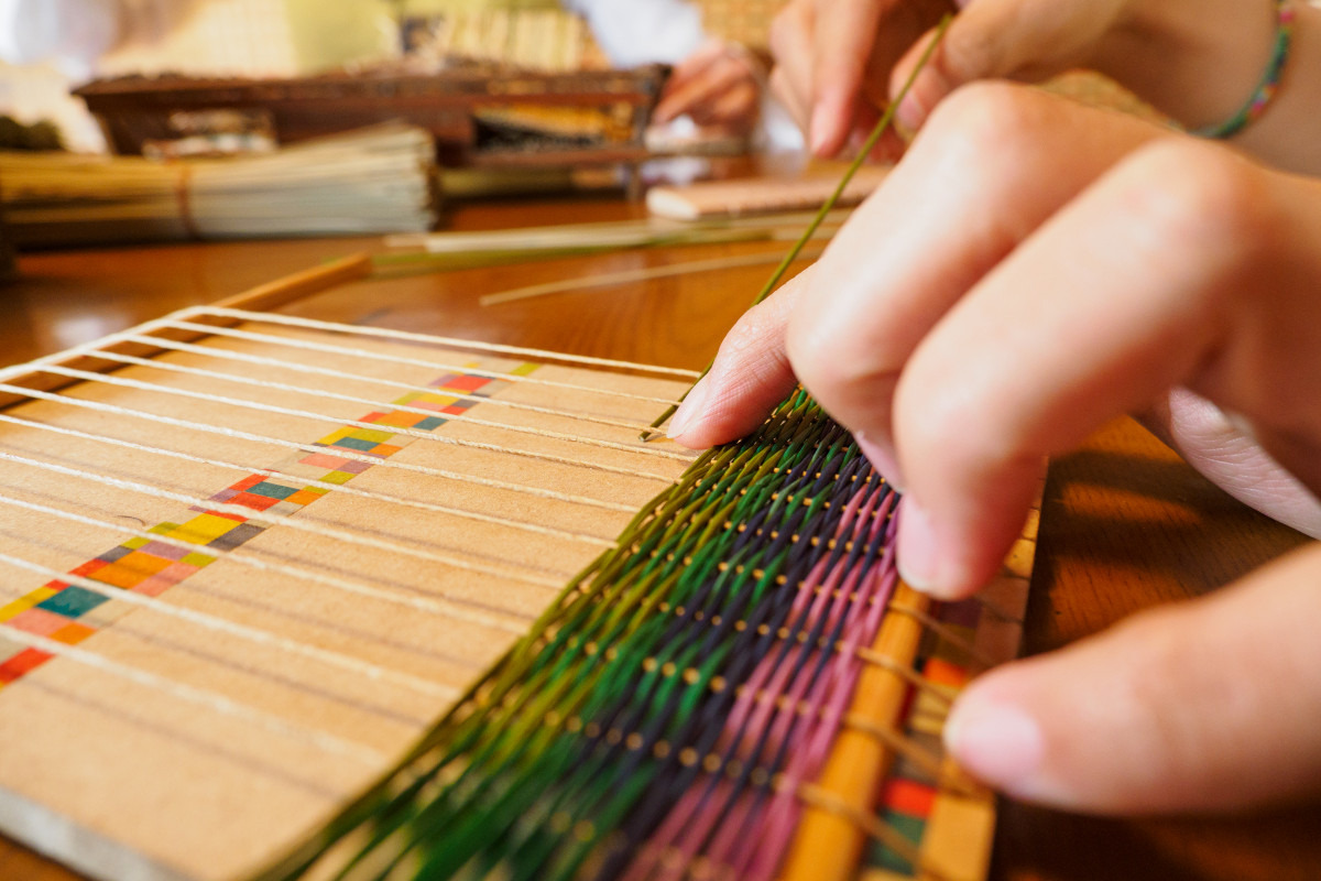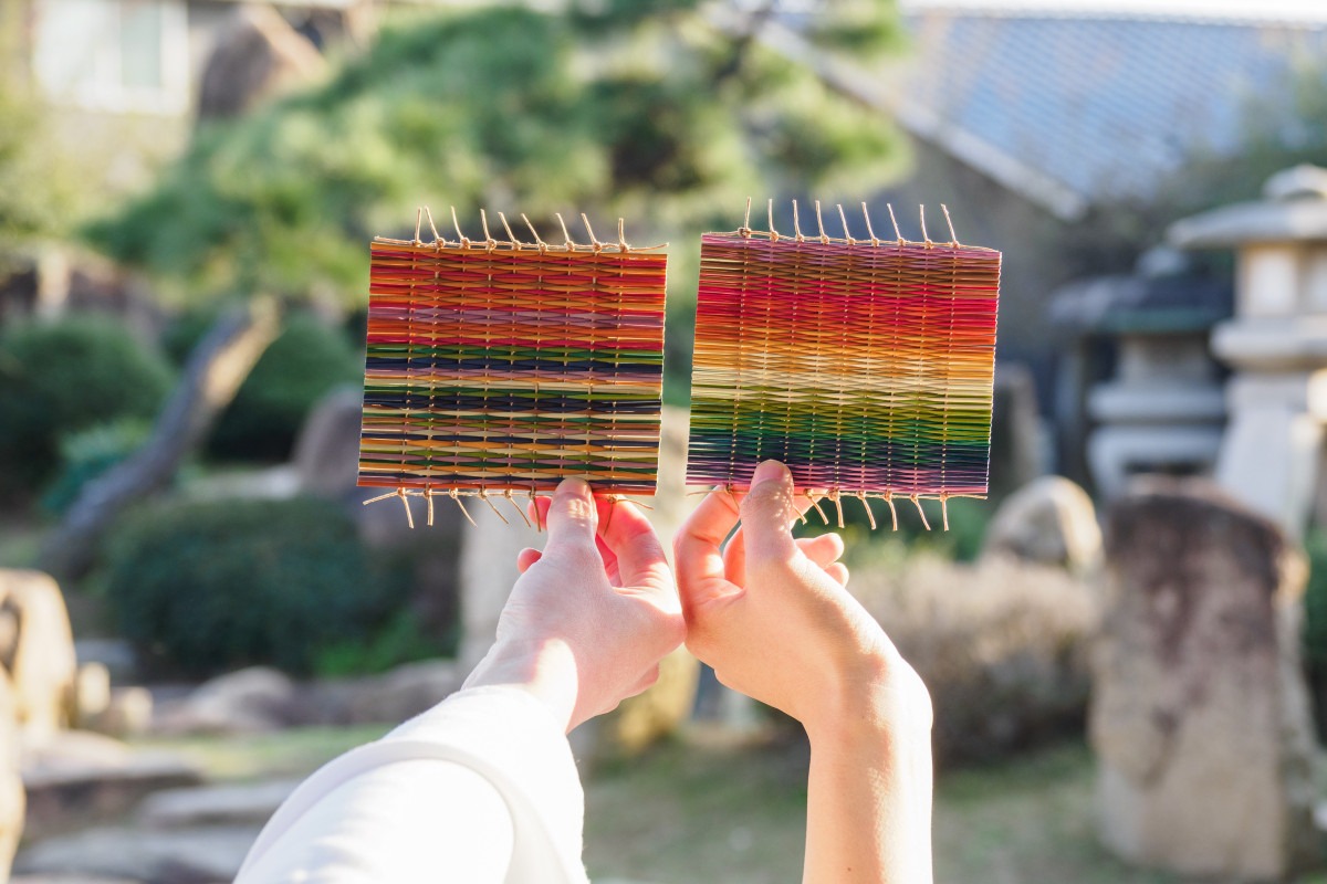 い草に顔を近づけてみると畳のようでいて少し違う、懐かしい香りがします。カラフルでありながら、やや控えめで美しい色調、糸や化学繊維などとは異なる触り心地に和を感じながら作業を進めます。模様の作り方は人それぞれ。グラデーション模様を目指しても良いし、全く異なる色調同士を組み合わせても面白い。不思議と最後には、個性溢れる素敵な仕上がりになります。