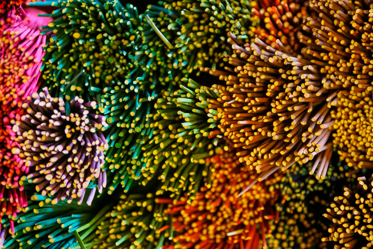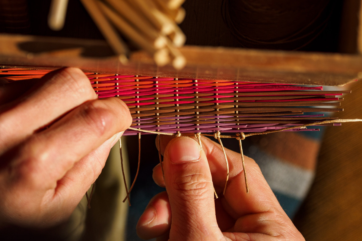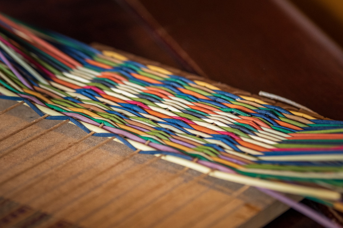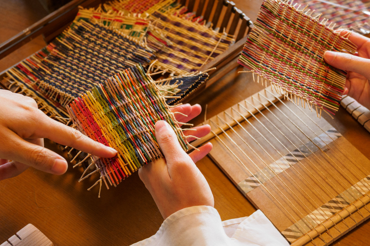 い草に顔を近づけてみると畳のようでいて少し違う、懐かしい香りがします。カラフルでありながら、やや控えめで美しい色調、糸や化学繊維などとは異なる触り心地に和を感じながら作業を進めます。模様の作り方は人それぞれ。グラデーション模様を目指しても良いし、全く異なる色調同士を組み合わせても面白い。不思議と最後には、個性溢れる素敵な仕上がりになります。