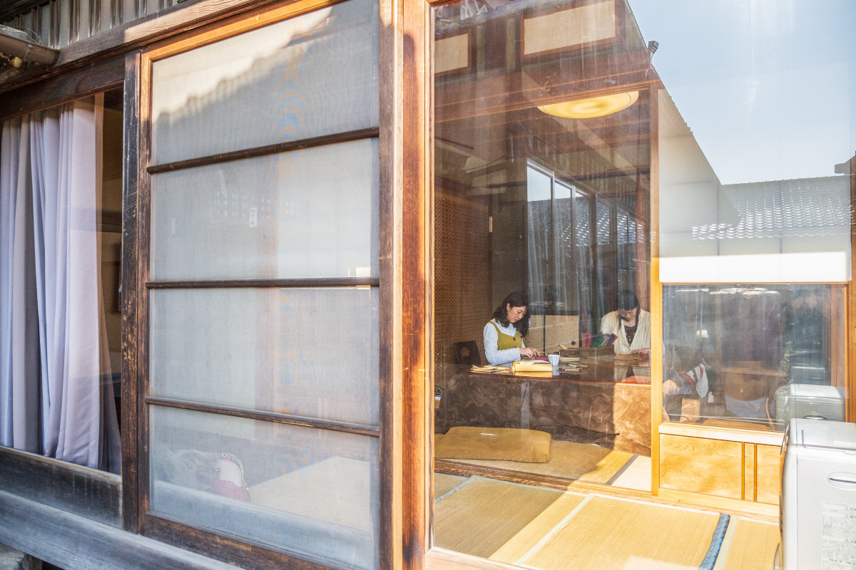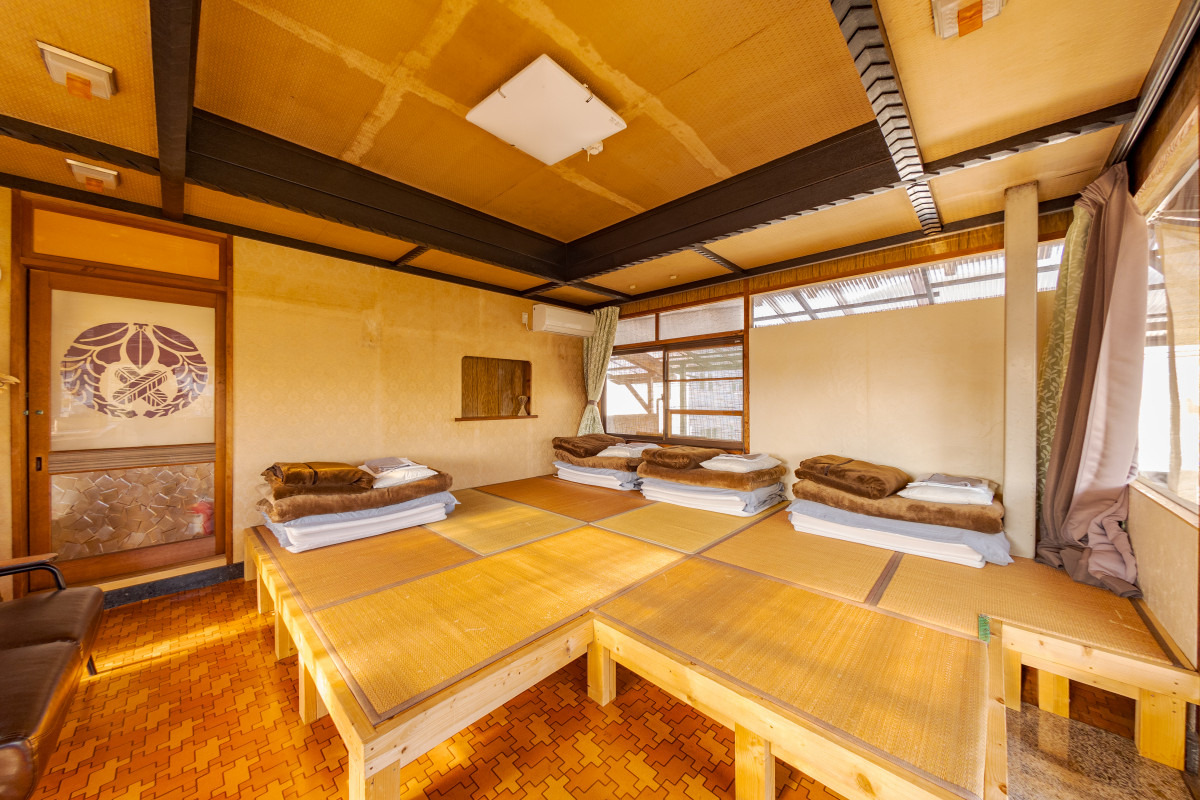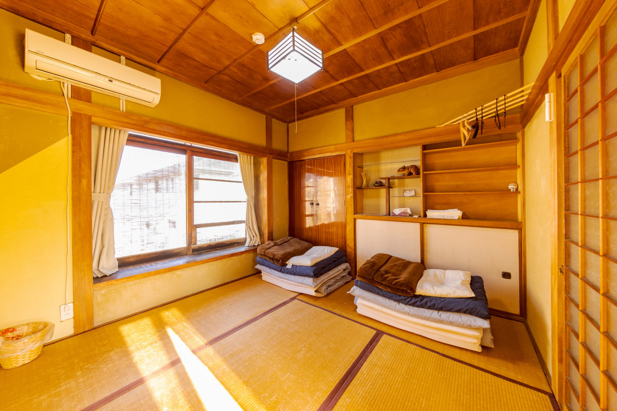 コースターの完成を待つ間、ゲストハウス内を散策。建物は2階建てで5部屋あり、1部屋に大人2〜5名宿泊可能(※ドミトリーは個人宿泊可)。日数・部屋タイプにもよりますが、宿泊料は1泊1人4,400~4,600円です。1階廊下奥には宿泊者が利用できるダイニング・キッチンスペースがあります。2階には日当たりの良い和室が並んでおり、どの部屋も数名でゆったり泊まるのに十分な広さ。つきあたりには、寝床が床より一段高い独特な構造の、ベランダ付きの個室も!