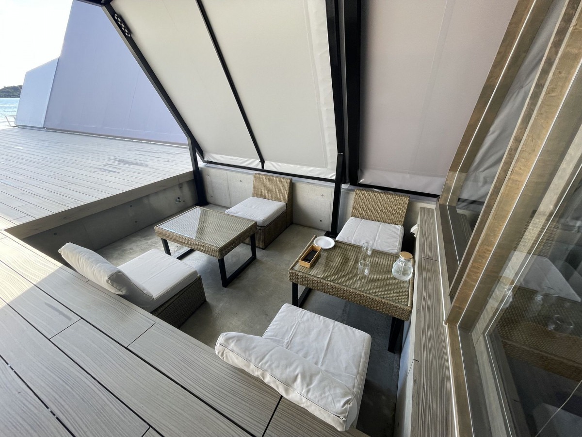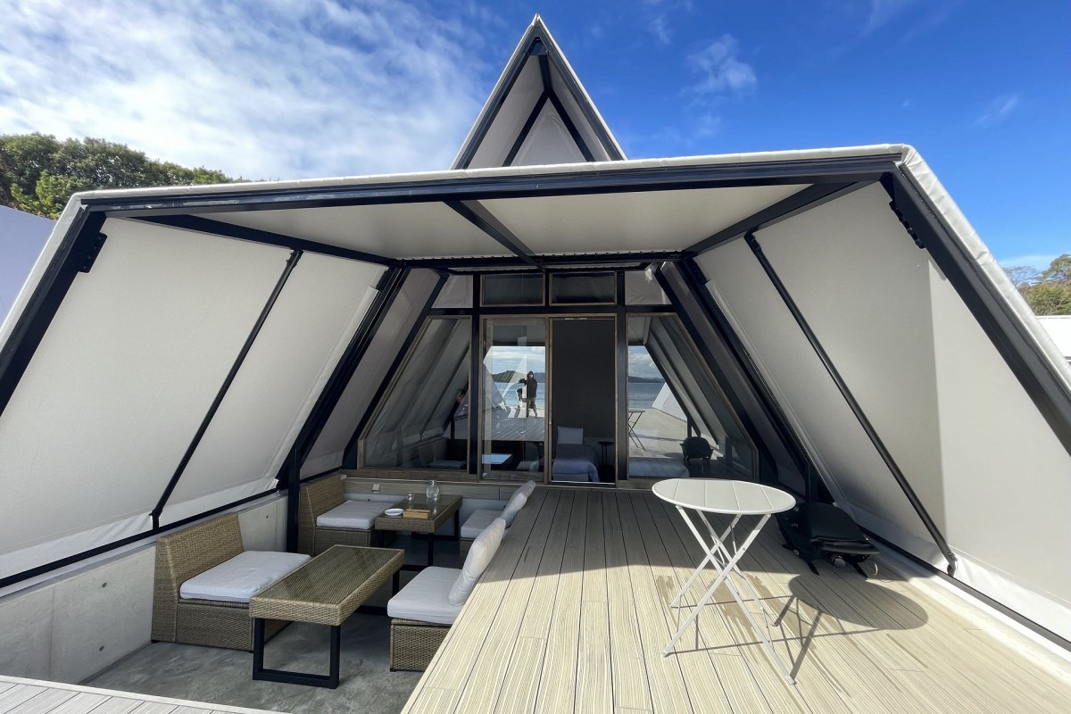 リゾート感たっぷりの瀬戸内海に面したグランピングリゾートです。8棟のヴィラ型テントはすべて海が見える造りになっていて、冷暖房、シャワー、トイレ完備。屋外には個別の食事スペースもあります。樽の型をしたサウナや海と一体化する感覚が味わえるインフィニティプール(夏季限定)、波の音を聞きながらゆっくり寛げるチルデッキなど、贅沢な時間が過ごせる場所も。アウトドア&バーベキュースタイルのコース料理や種類豊富なドリンクも魅力で、幅広い世代で楽しめます。