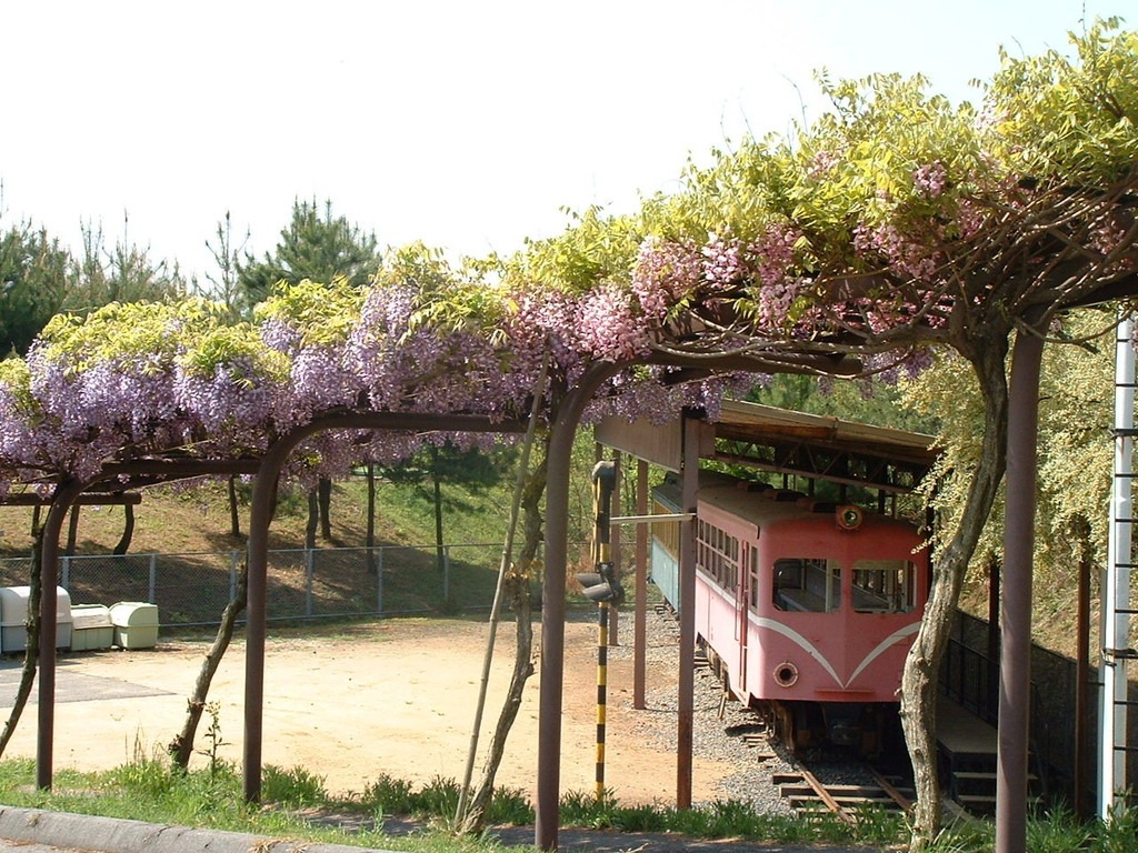 広大な敷地内にはオートキャンプ場やパターゴルフ場、アスレチックなどさまざまな施設があります。4月下旬には約300mの藤棚のフジが見事に咲き誇ります。