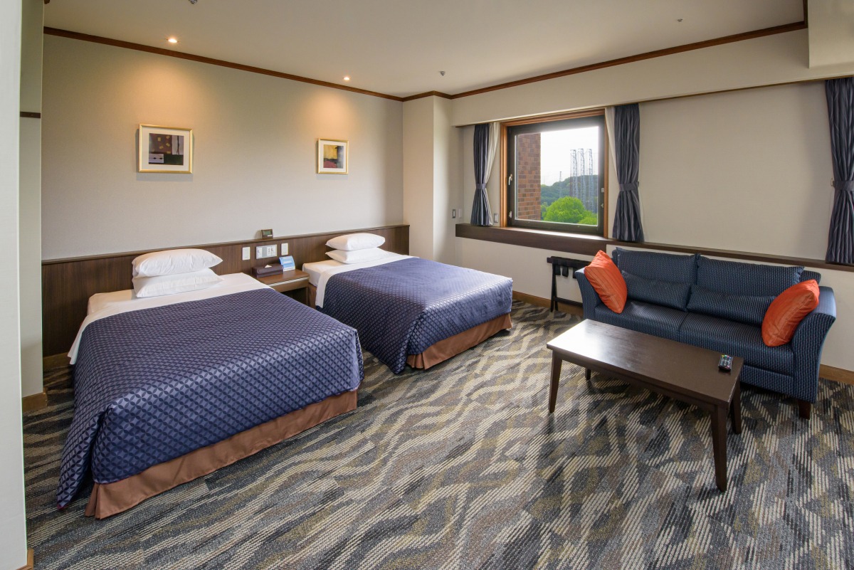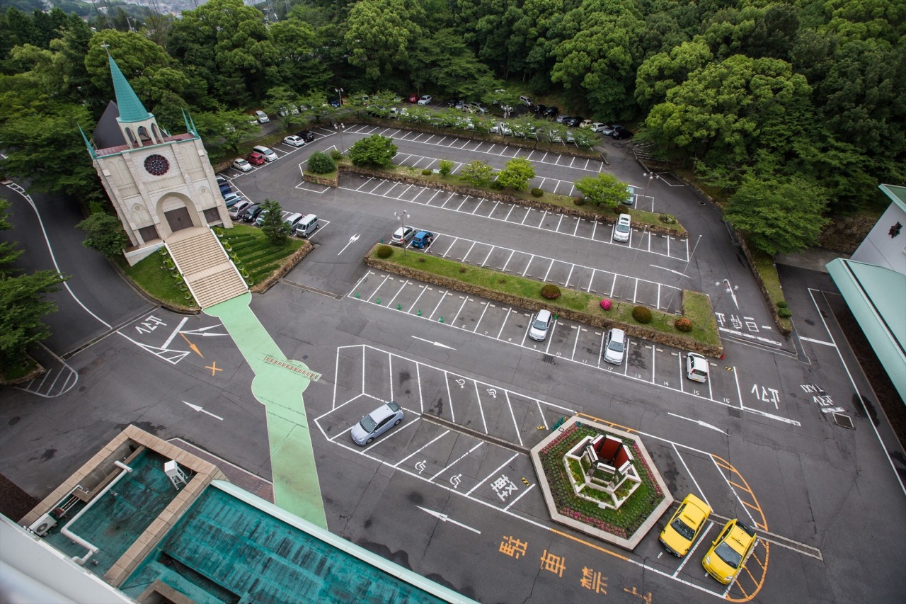 小高い山の上に建ち、豊かな自然に恵まれており、四季折々の風情を楽しめます。市街地側の客室からは天気が良ければ、後楽園、岡山城を望めます。普通車の駐車は無料なので車でも安心。岡山駅西口からは定期送迎バスを運行しております。