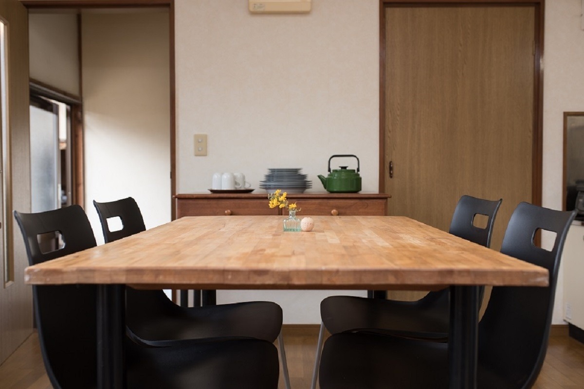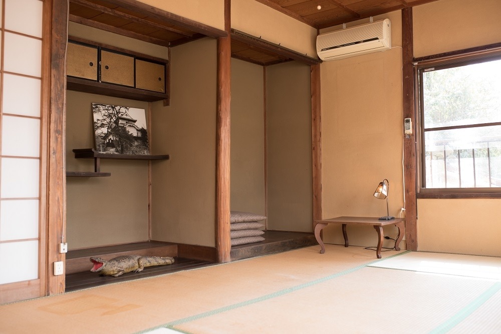 宿にはキッチン、冷蔵庫、洗濯機を完備しているので長期滞在される外国の方も多くいらっしゃいます。2Fが寝室で畳のお部屋になっており、裏山からは鳥の声が聞こえてきます。