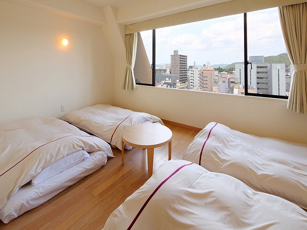 靴を脱ぎ、床に座るコンセプトルームがある岡山市のホテル。布団敷のファミリールームもあります。ホテル1階が駐車場でお子様連れや車出張の方に便利です。