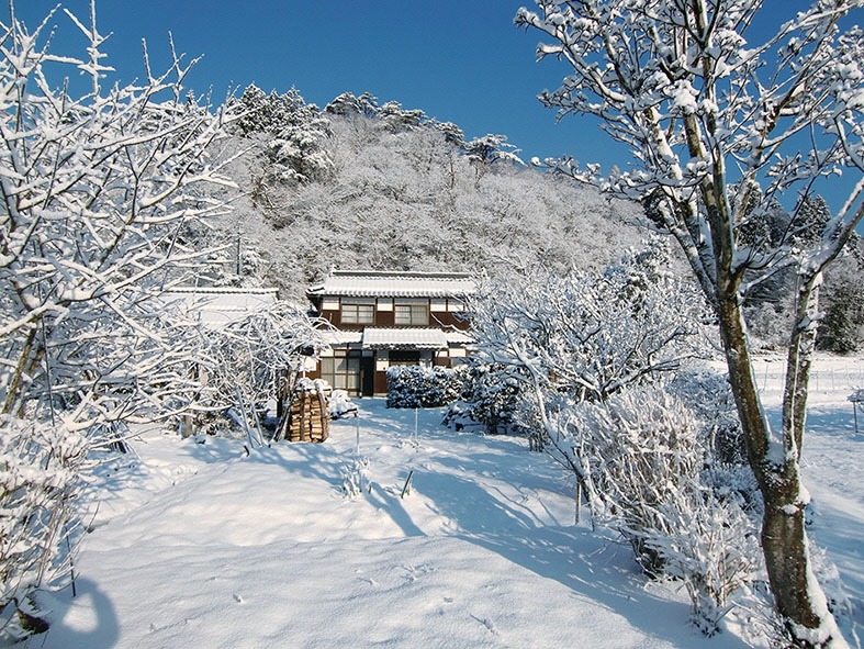 鳥取県との県境、標高500mにある宿です。春の山菜採り、秋のキノコ他、四季折々の多彩な野菜を自家農園で収穫。山では、キノコの駒うち、薪割りを体験。冬は大量の積雪があり、雪国情緒を満喫できます。