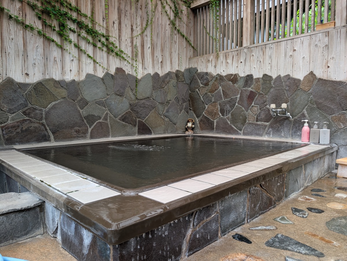 源泉かけ流しの貸切温泉があり、日帰り入浴でも利用可能です。穏やかな山と季節の風情を楽しめます。