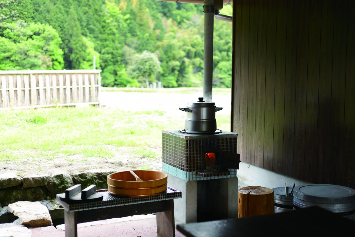自然豊かな環境の中、一棟貸し切りで周りに気を遣うことなく、家族や友人と普段とは違った時間を過ごせる築150年の古民家宿。宿の露天風呂では奥津温泉のお湯で入浴ができます。郷土料理体験ではかまどを使ったおこわ作りを、宿に隣接する畑や杉林、竹林では、無農薬で栽培している野菜やタケノコ、原木シイタケなどの収穫体験ができます。