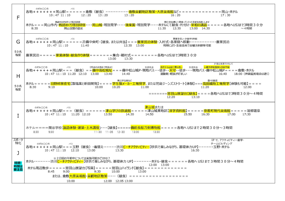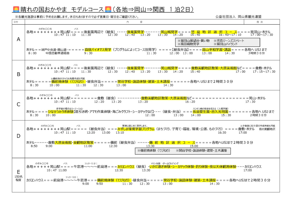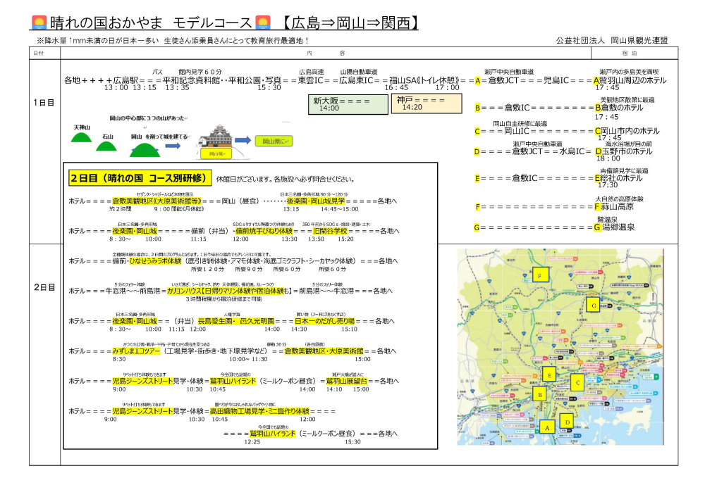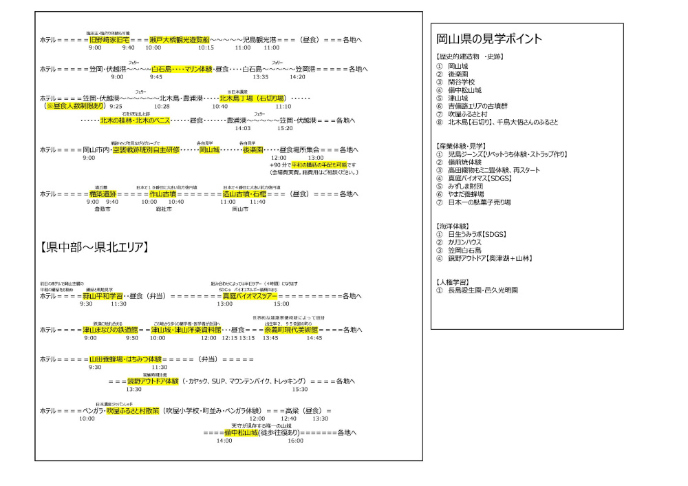 資料はPDF形式でダウンロード可能ですので、プラン作成や学校での検討にそのまま活用いただけます。岡山での体験を通じて、生徒たちに豊かな学びと楽しい思い出を届けるための参考としてご活用ください。