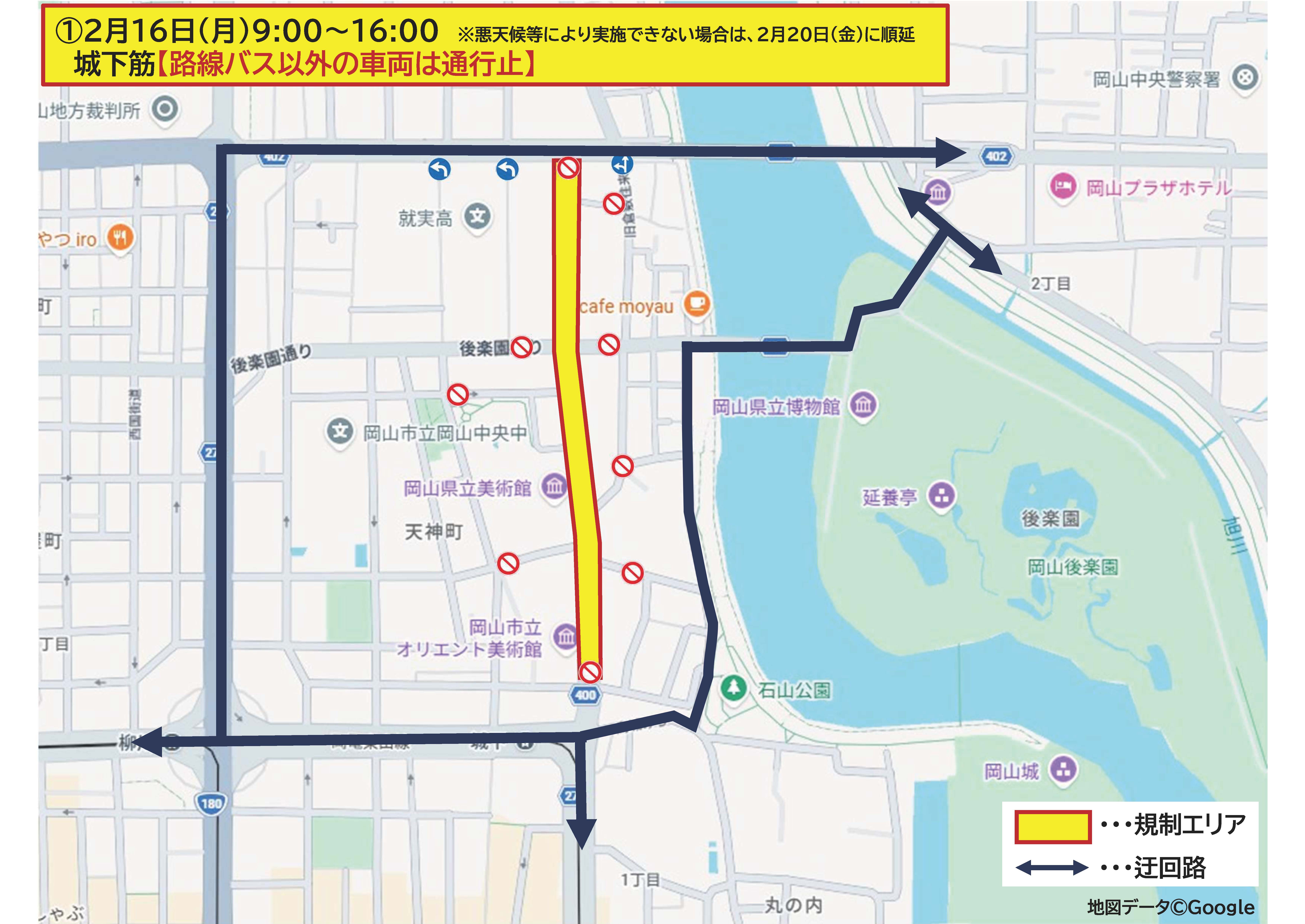①2月16日(月)9:00~16:00 城下筋 路線バス以外の車両は通行止