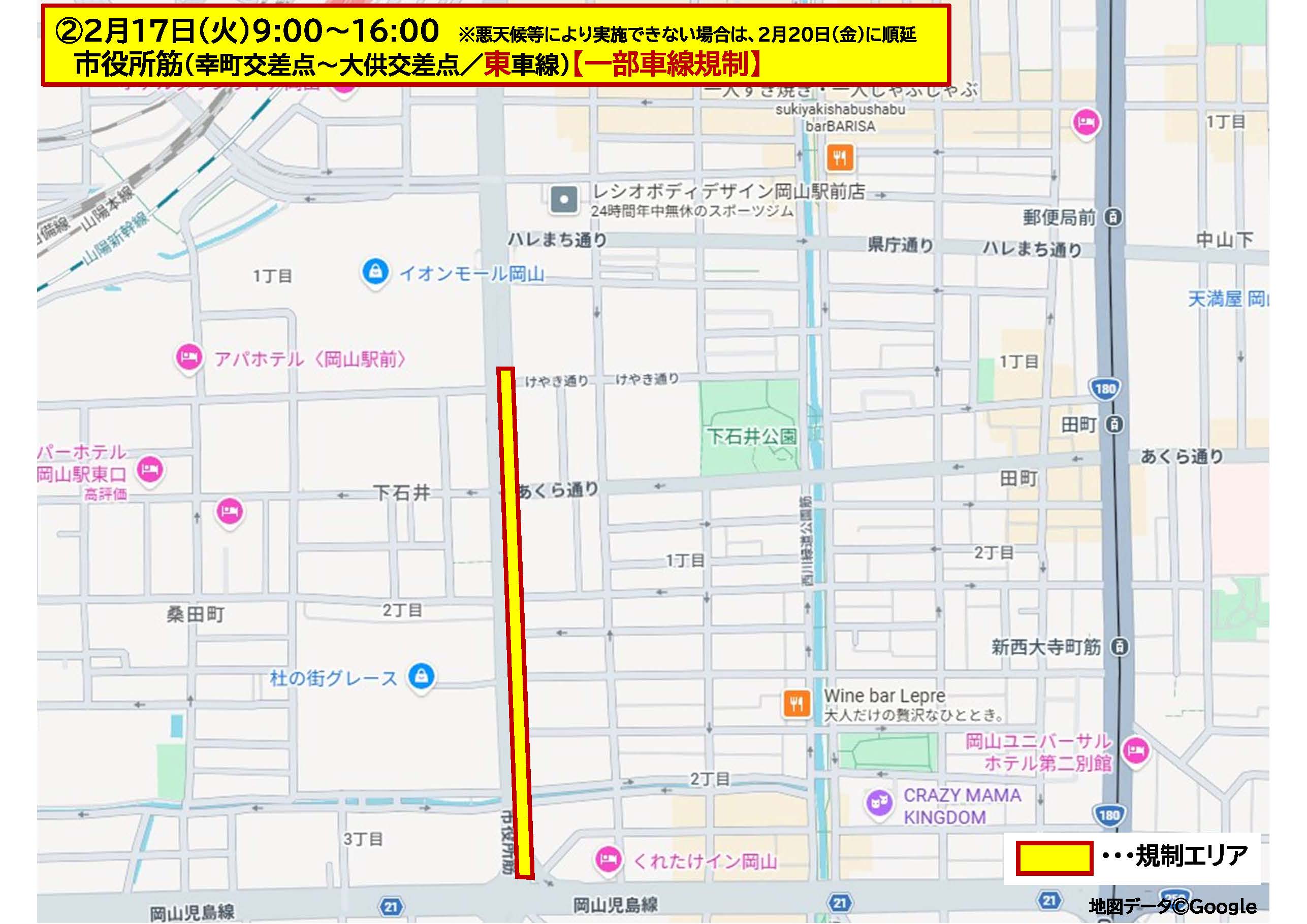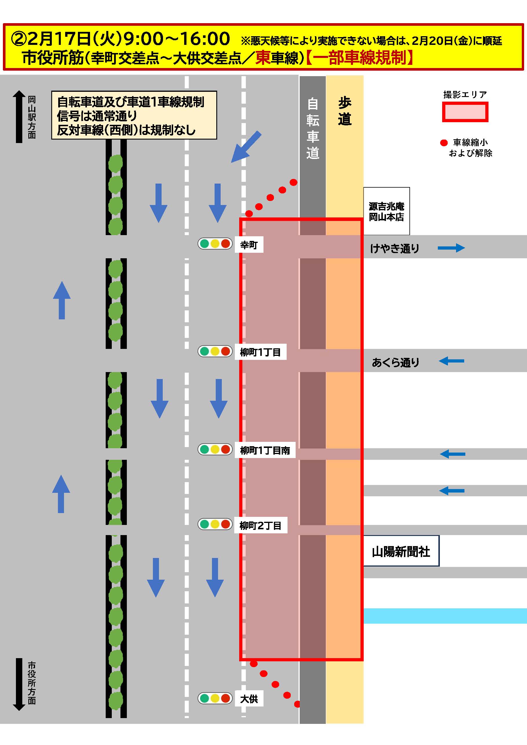 ②2月17日(火)9:00~16:00 市役所筋(幸町交差点~大供交差点/車線)一部車線規制