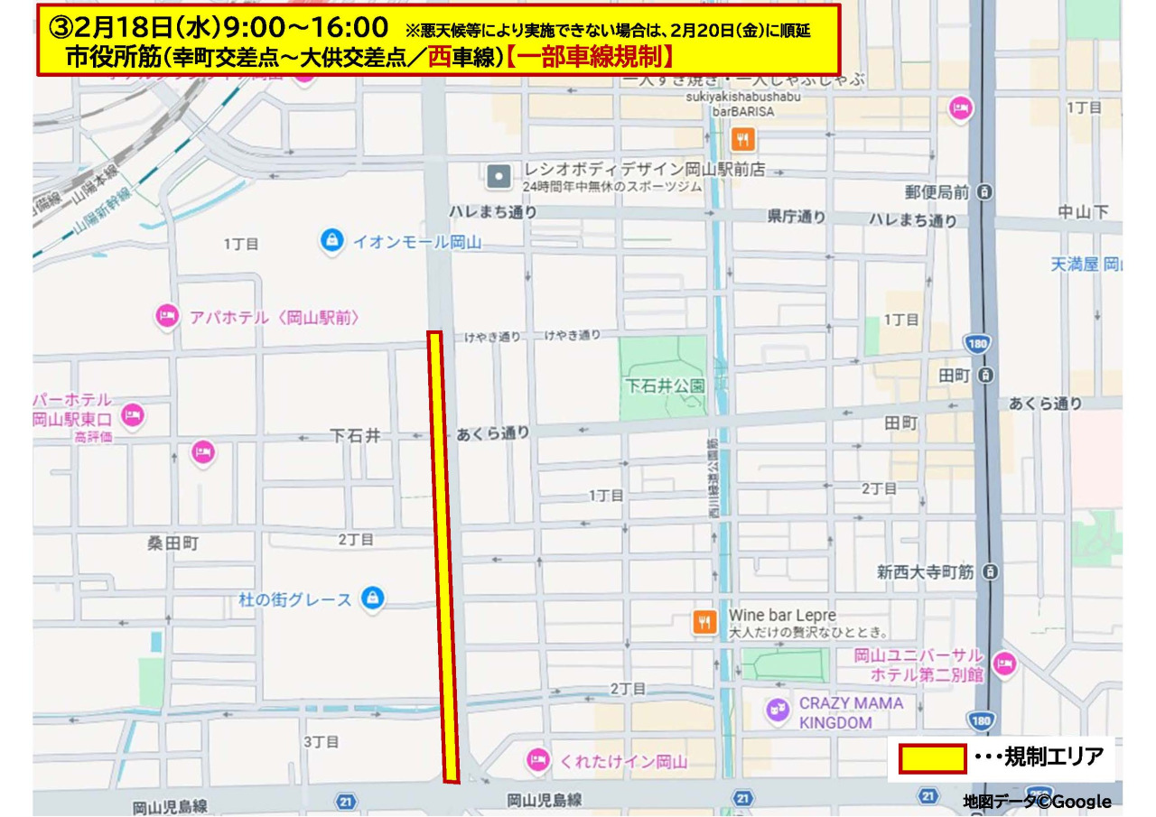③2月18日(水)9:00~16:00 市役所筋(幸町交差点~大供交差点/西車線)一部車線規制
