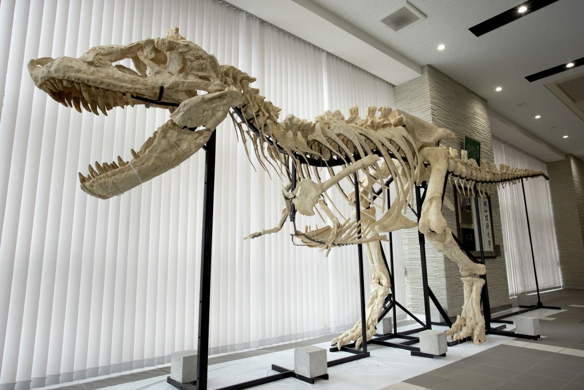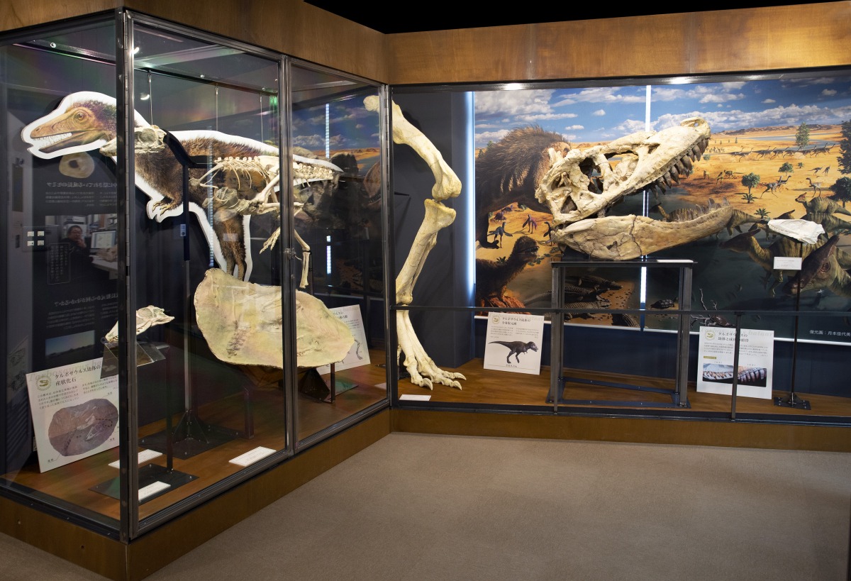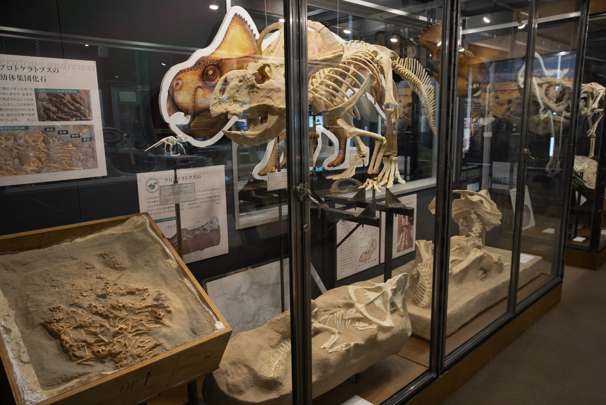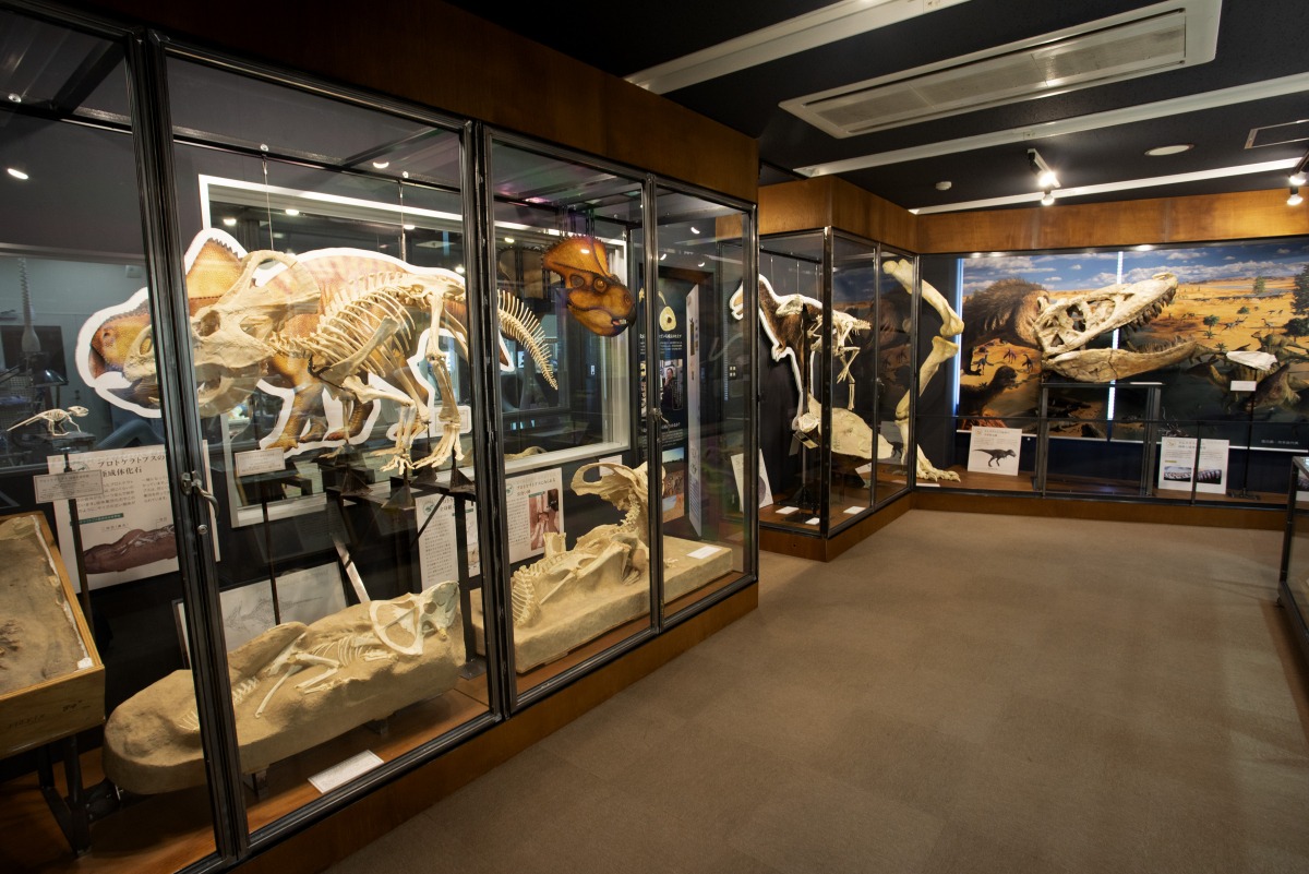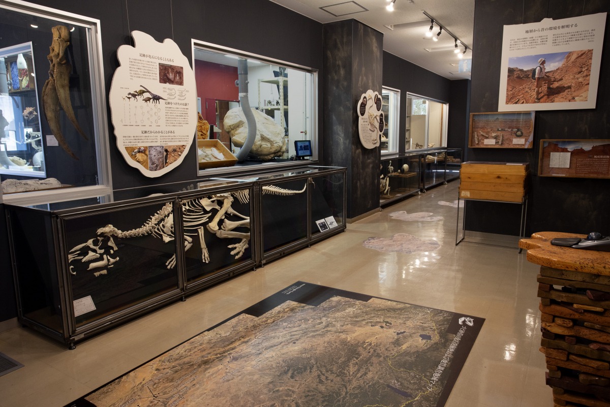 この博物館では、標本だけでなく、モンゴル・ゴビ砂漠での発掘調査から研究に至るプロセスも展示しています。展示ホールでは、モンゴル・ゴビ砂漠での発掘調査、研究についての紹介や、日本ではここでしか見られないゴビハドロスの骨格標本、世界最大級クラスの恐竜の足跡化石も見ることができます。発掘地の3Dデータを実際に操作したり、調査地のマップを調べることもできます。メイン展示室では、モンゴル・ゴビ砂漠を代表する恐竜、タルボサウルスとプロトケラトプスを中心に、幼体から生体まで、さらに産状化石など、さまざまな標本を見ることができます。その他、標本室、化石処理室・研究室があります。