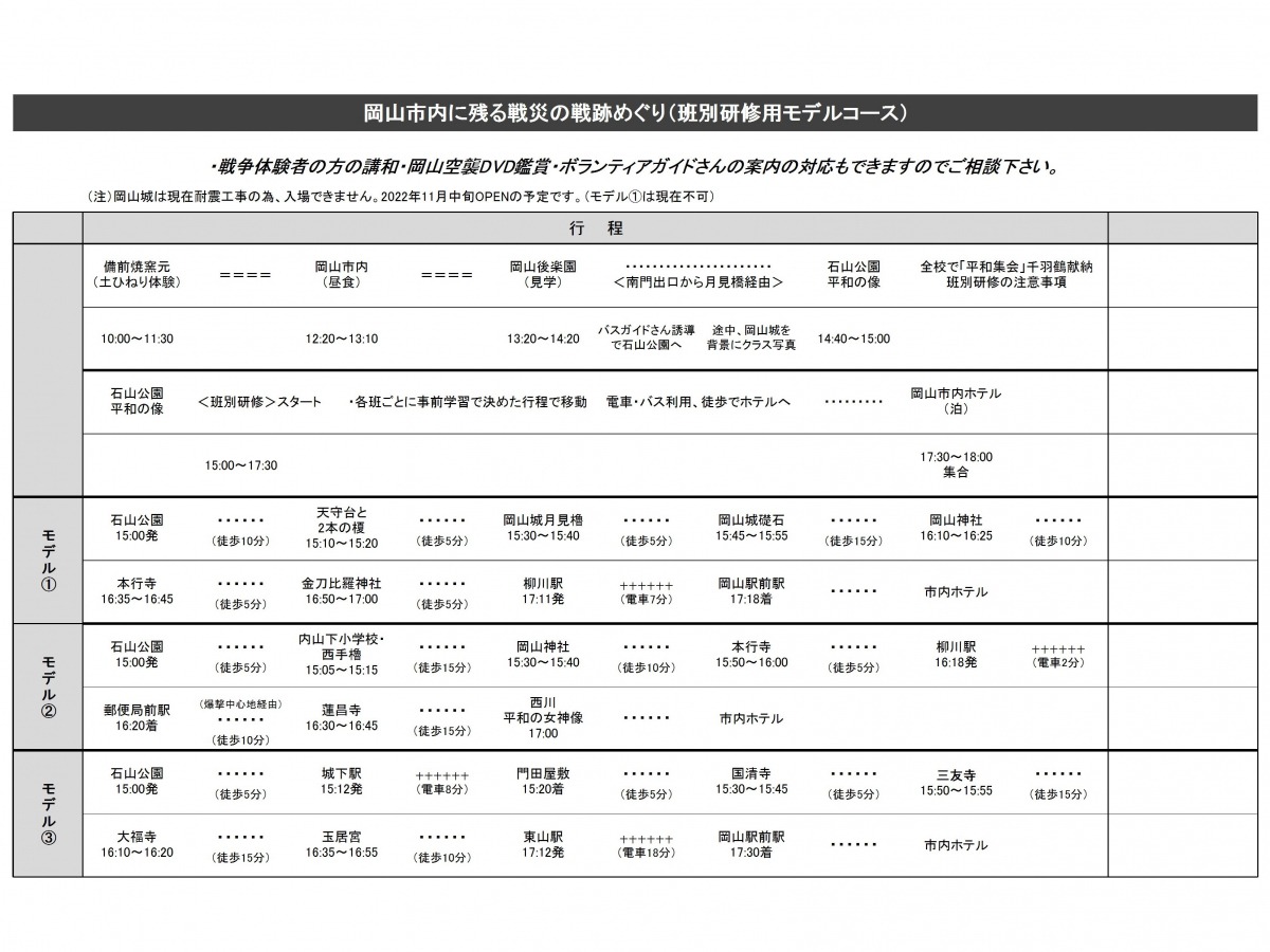 戦災の遺跡は、徒歩、路面電車の利用で回れる距離にありますので、岡山の平和学習のプログラムとして班別研修やクラス別研修にお勧めです。
