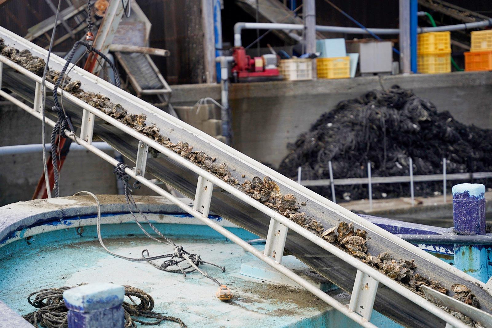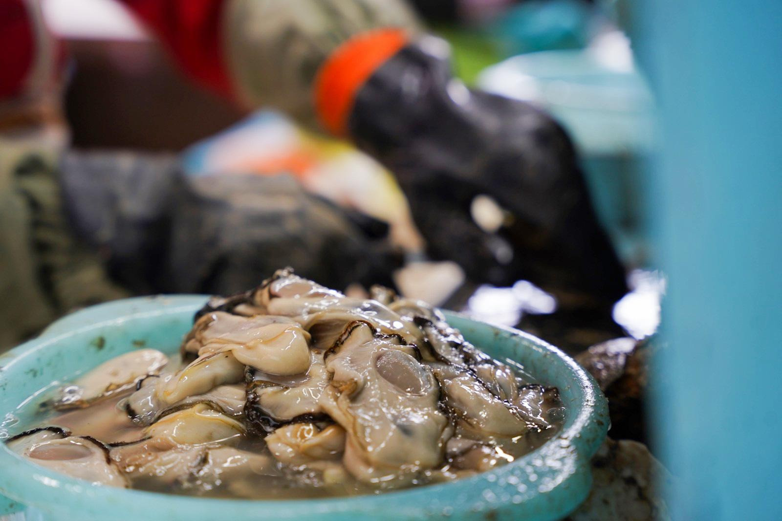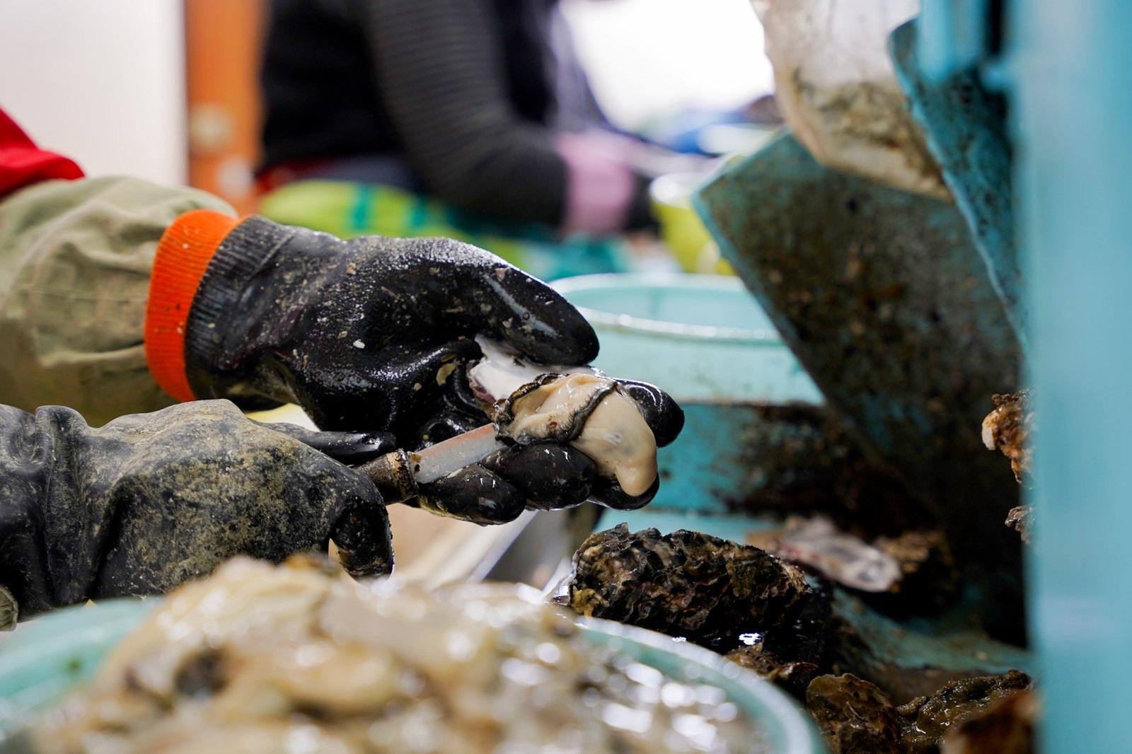 冬の極寒の中、牡蠣小屋では寒さに負けず、牡蠣を殻から外す作業がおこなわれています。