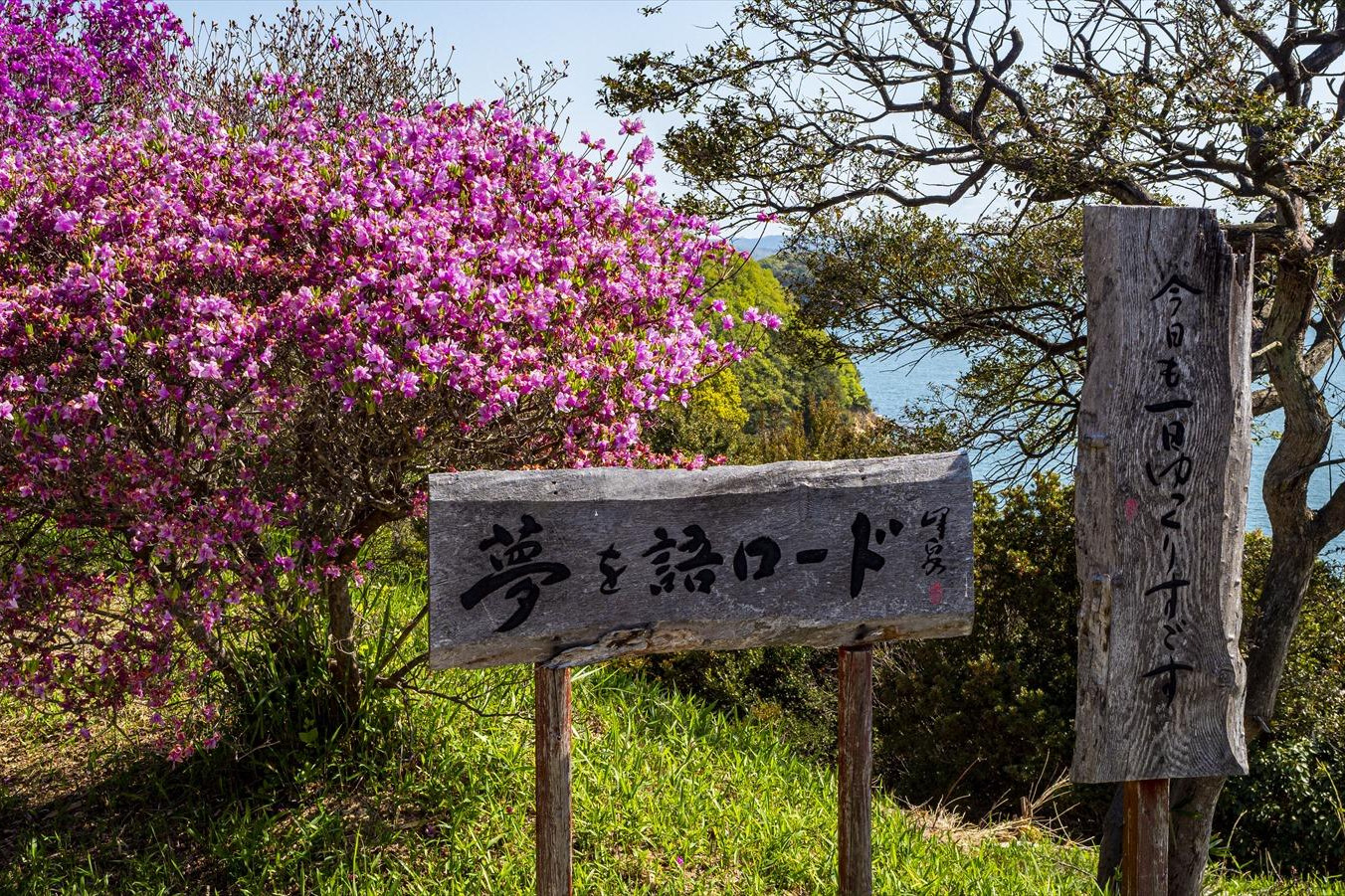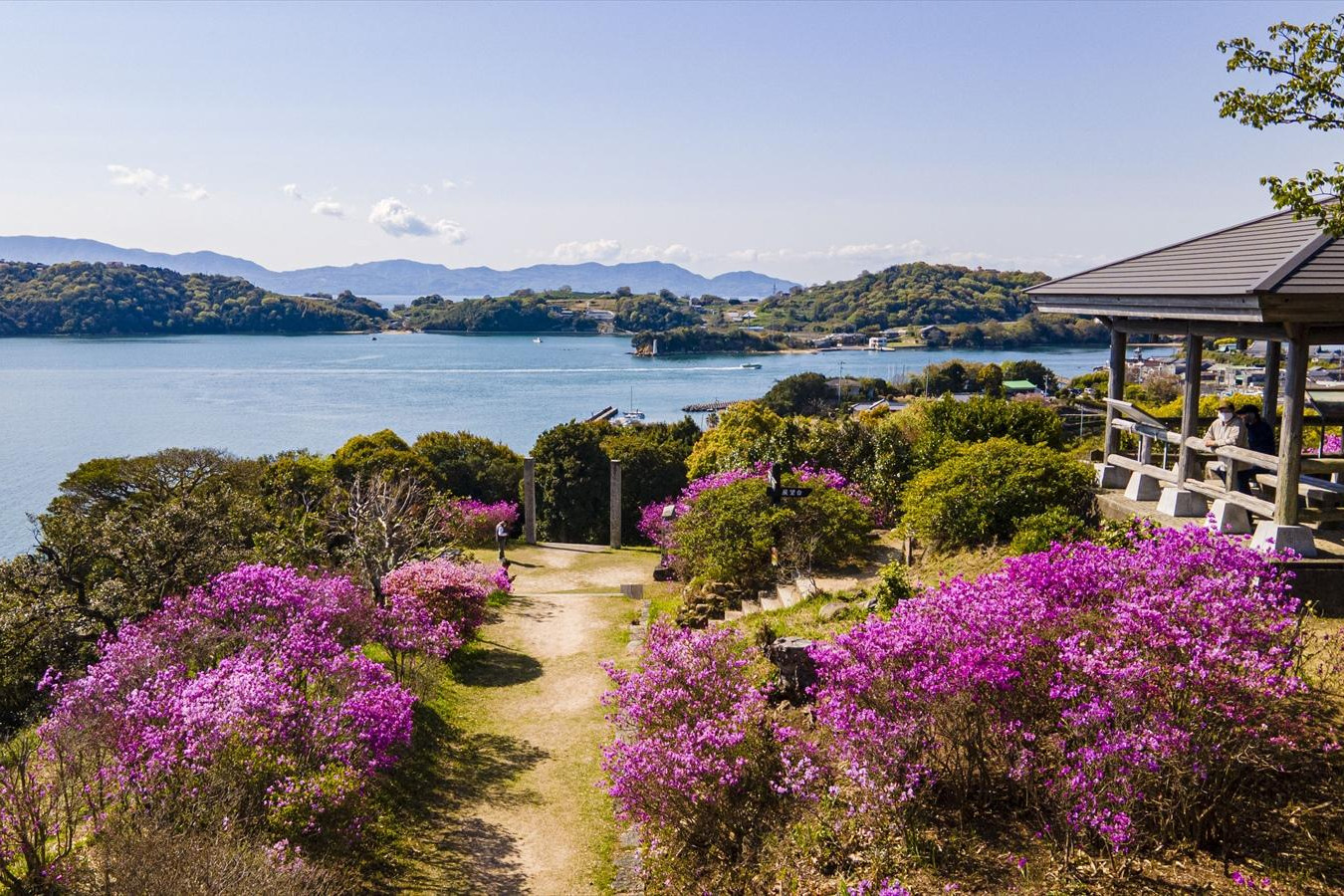 牛窓海水浴場から、上がる長い階段の参道。その中腹にある「望洋亭」周辺はツツジに囲まれる花の参道。春の紫に染まる道は桜とは一味違う雰囲気に包まれます。