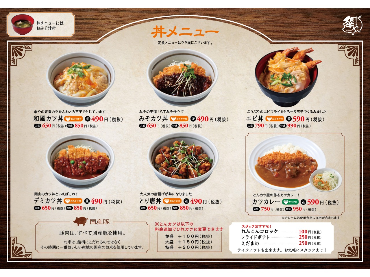 とんかつと大統領ラーメンのお店。傘やの豚肉は、全て国産豚を使用。490円(税別)のかつ丼をはじめ、ご飯おかわり自由の定食など、お得なメニューが豊富です。漬物食べ放題もひそかに人気。お持ち帰りも大歓迎。皆様のご来店を心よりお待ちしております。