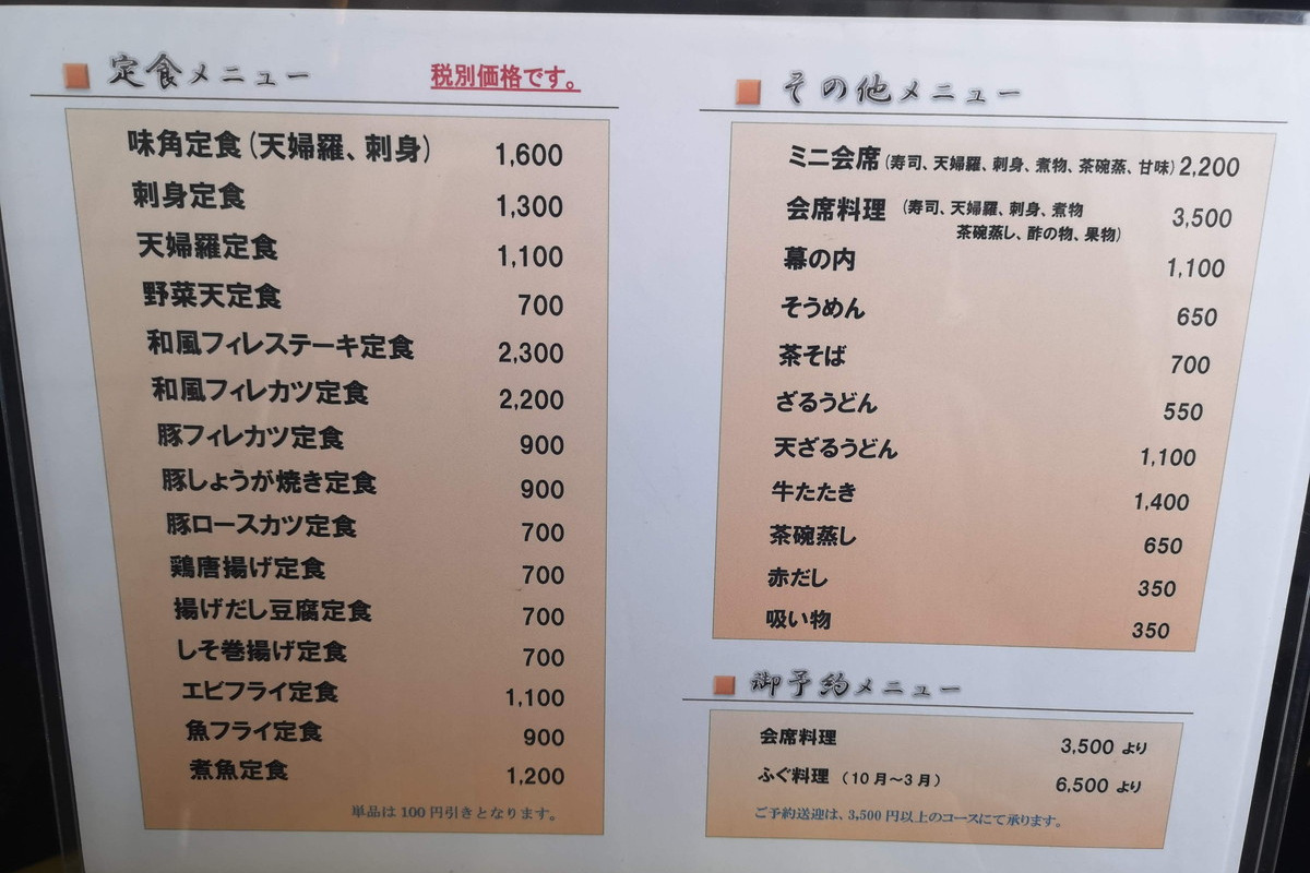 新鮮な魚料理を楽しめる。厚切り、ボリュームたっぷりの刺身が人気。10月から3月まではふぐ料理も提供。お料理3,500円(税別)、5名様以上で送迎可。