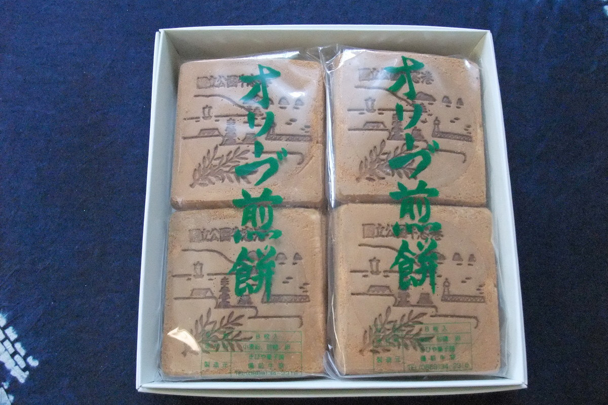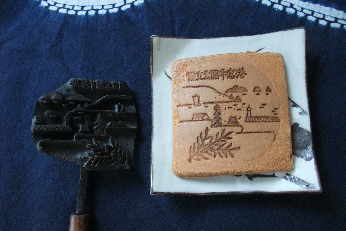 「オリーブせんべい」牛窓オリーブ園の開園を記念して製造をはじめた手焼きのおせんべいです。瀬戸内海国立公園牛窓の風景とオリーブをあしらった焼き印が押されています。