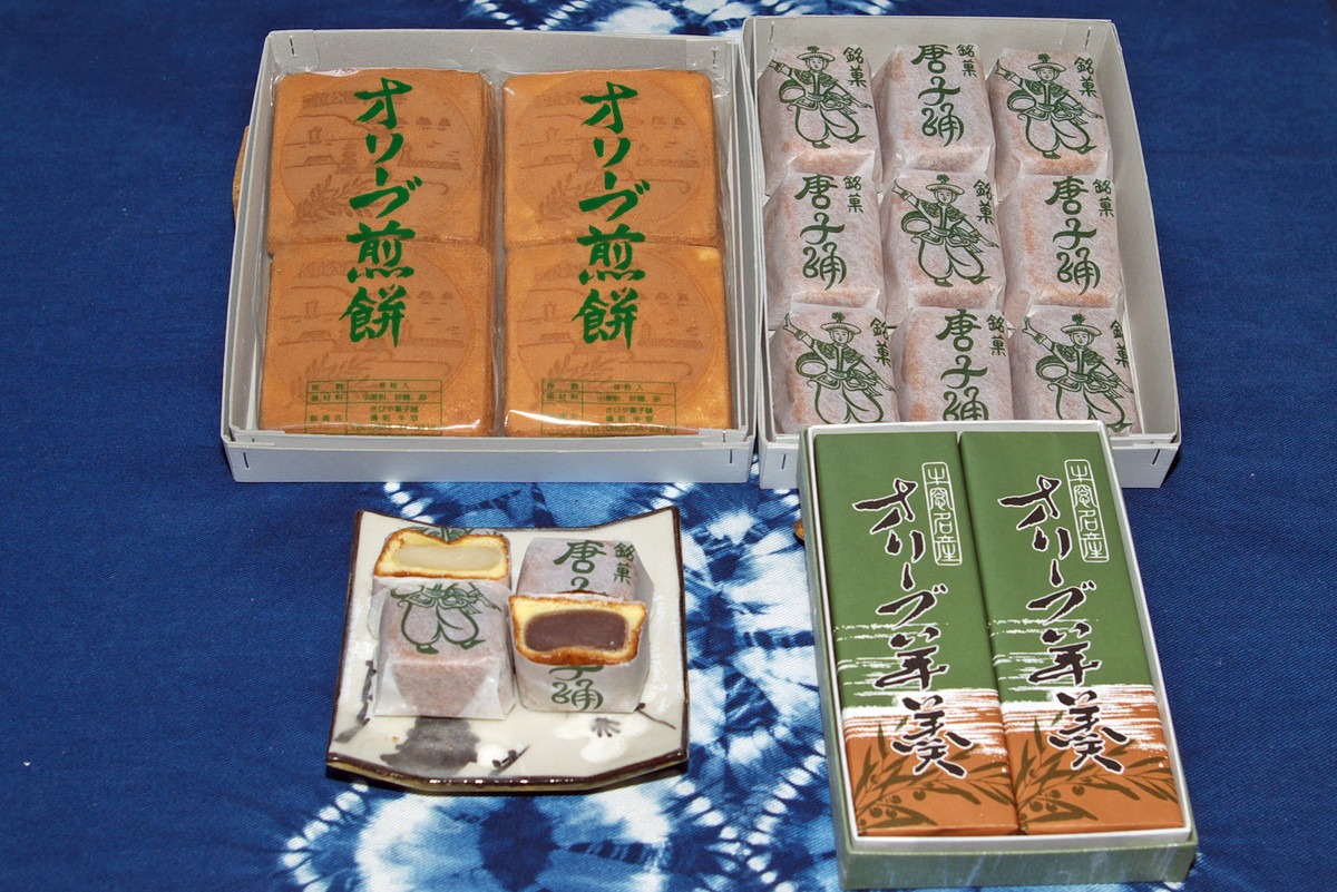「オリーブようかん」日本のエーゲ海といわれる牛窓を象徴するオリーブの塩漬けと、冬の極寒期のみ製造される国産高級寒天、白あんベースで仕上げた本練りようかんです。昭和28年より、約70年続くロングセラー商品です。