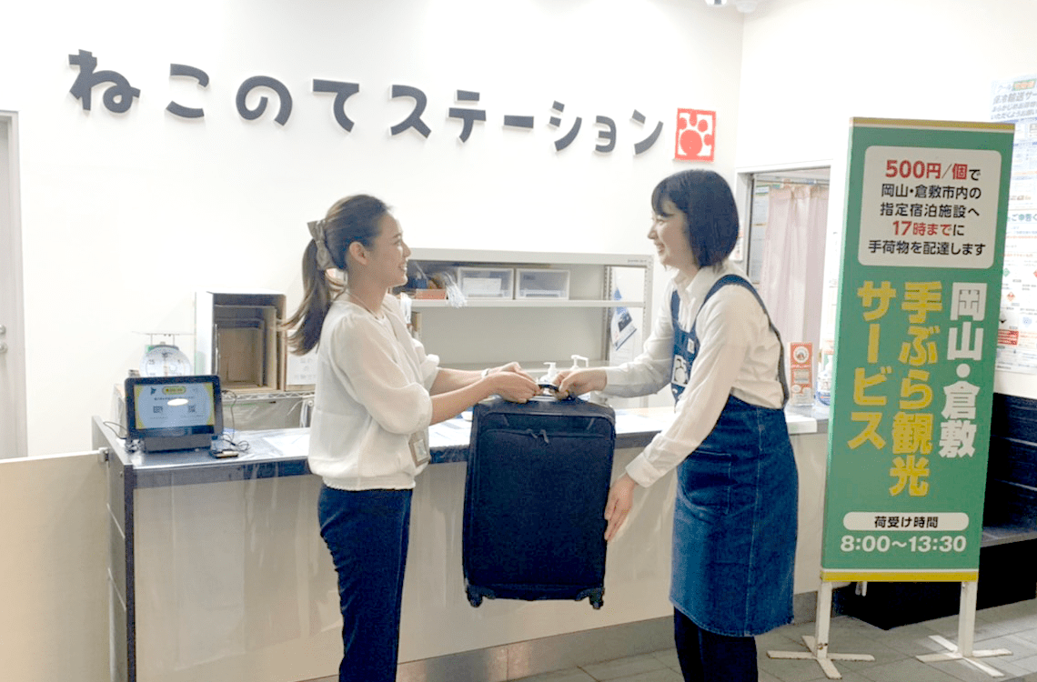 ねこのてステーションに13:30までに荷物を預ければ、岡山市内・倉敷市内の指定宿泊施設に、当日の17:00頃(2025年5月21日~サービス開始の玉野市の施設は17:30頃)までに手荷物を配達。