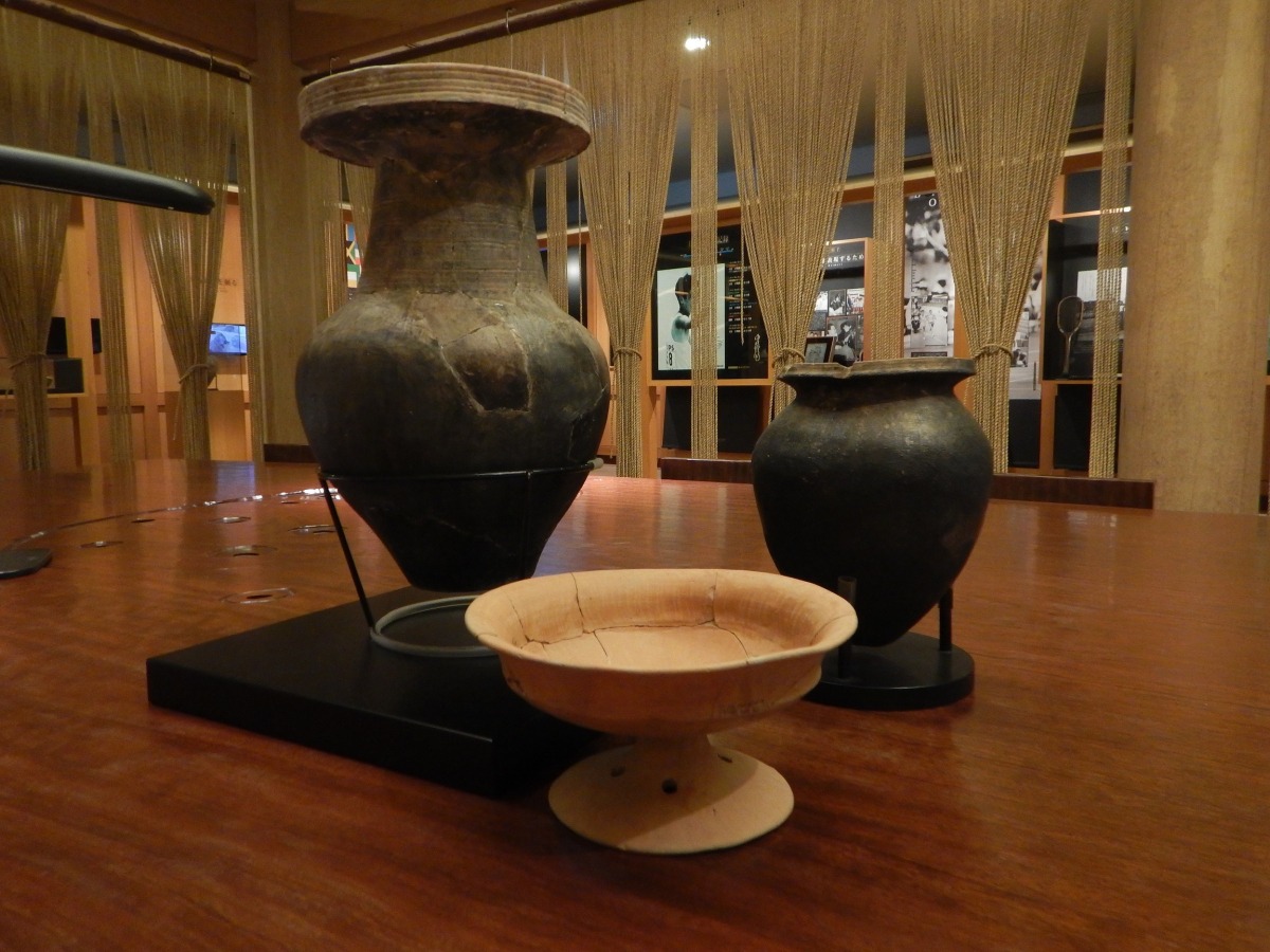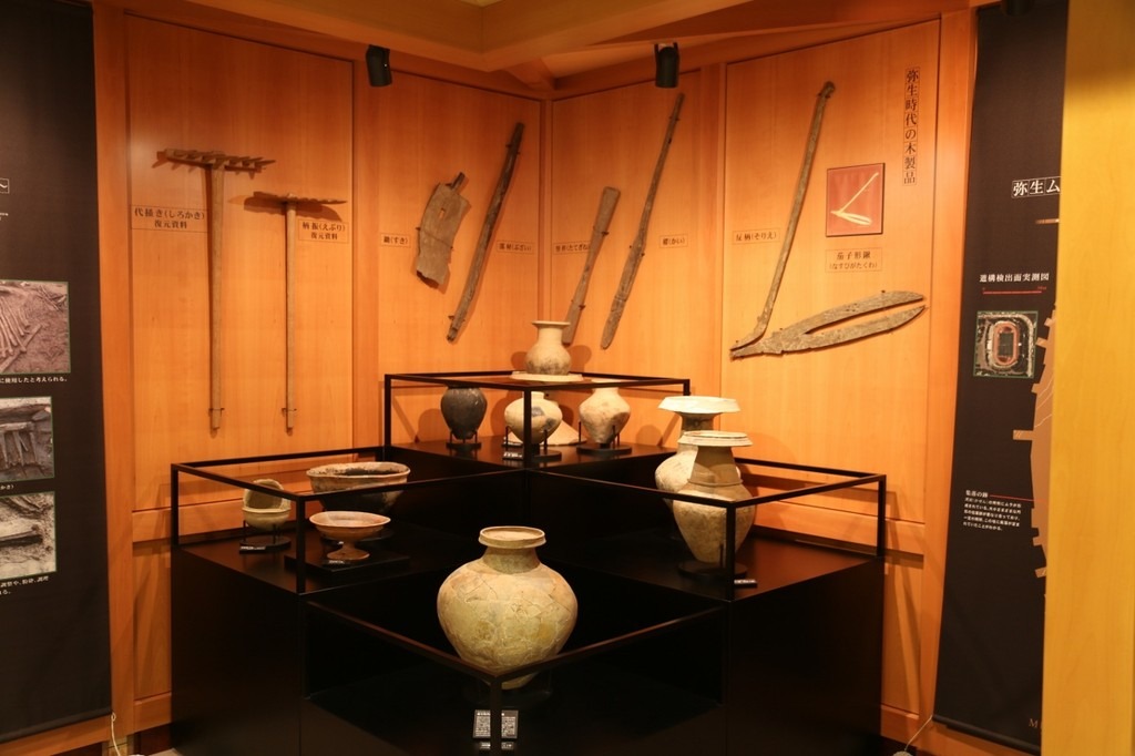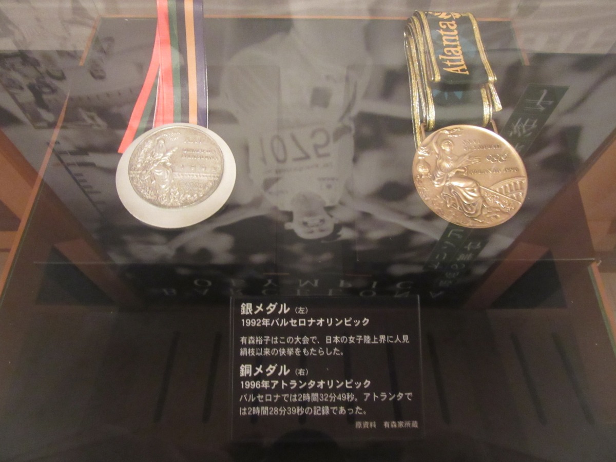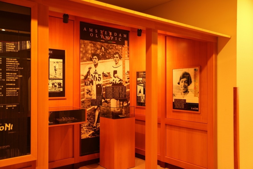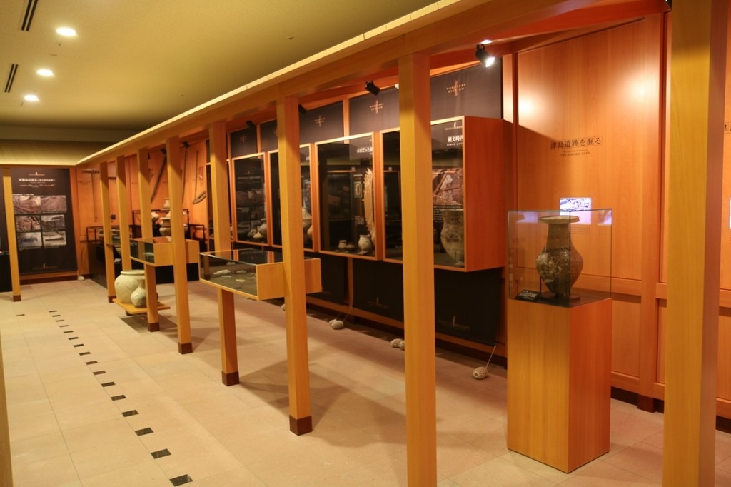 岡山県総合グラウンドの地下には、縄文時代から近代にかけての複合遺跡である津島遺跡が眠っています。昭和46年に一部が国指定史跡に指定されました。さらにその後の発掘調査の結果を受けて、平成14年に史跡の範囲が拡大され、現在に至っています。発掘調査で出土した品々を中心とする歴史的な遺物と、岡山県出身の世界的なアスリートである人見絹枝、有森裕子両氏ゆかりの品々を展示しています。