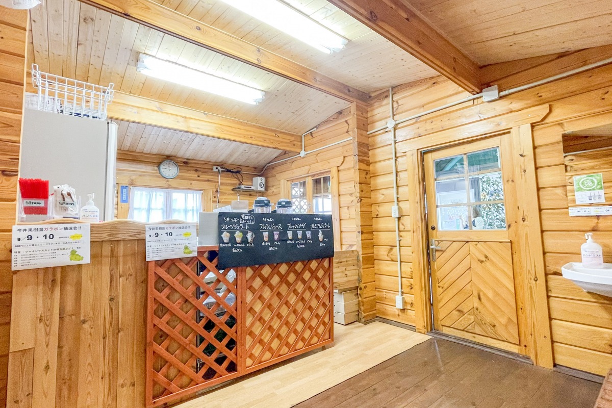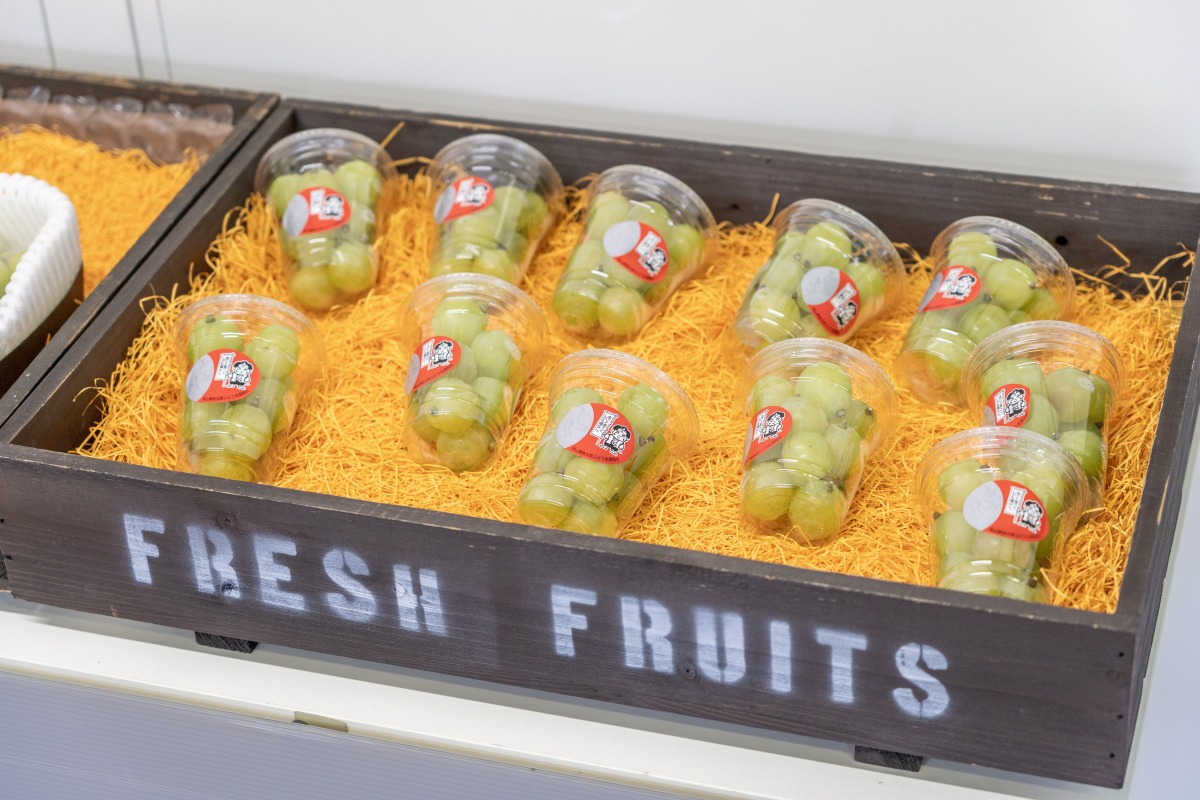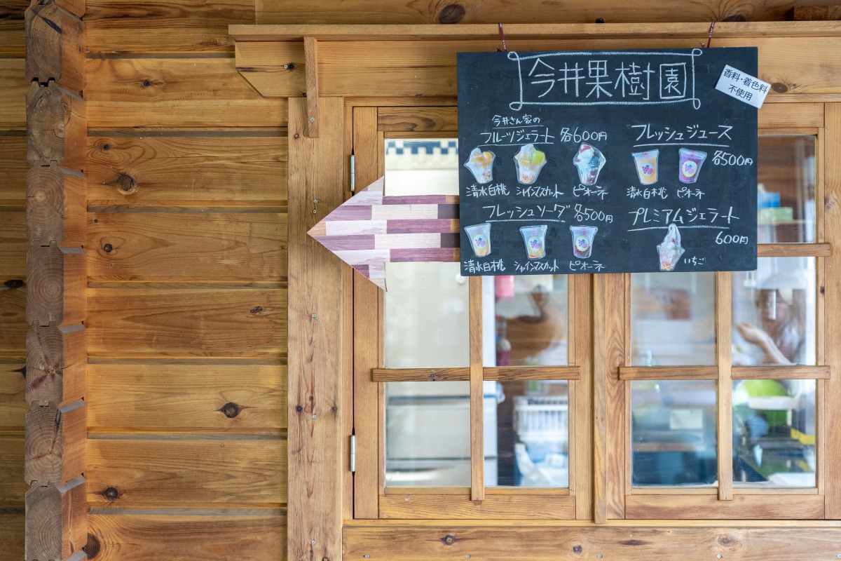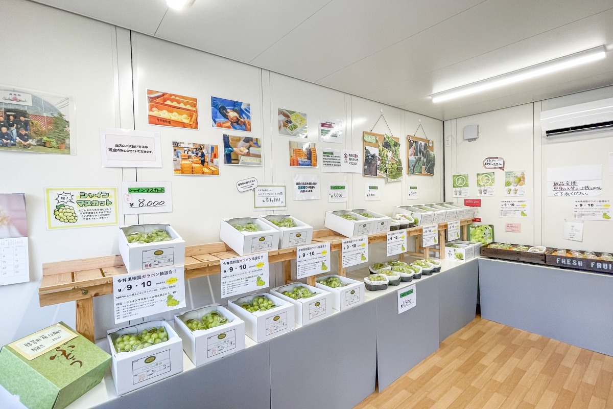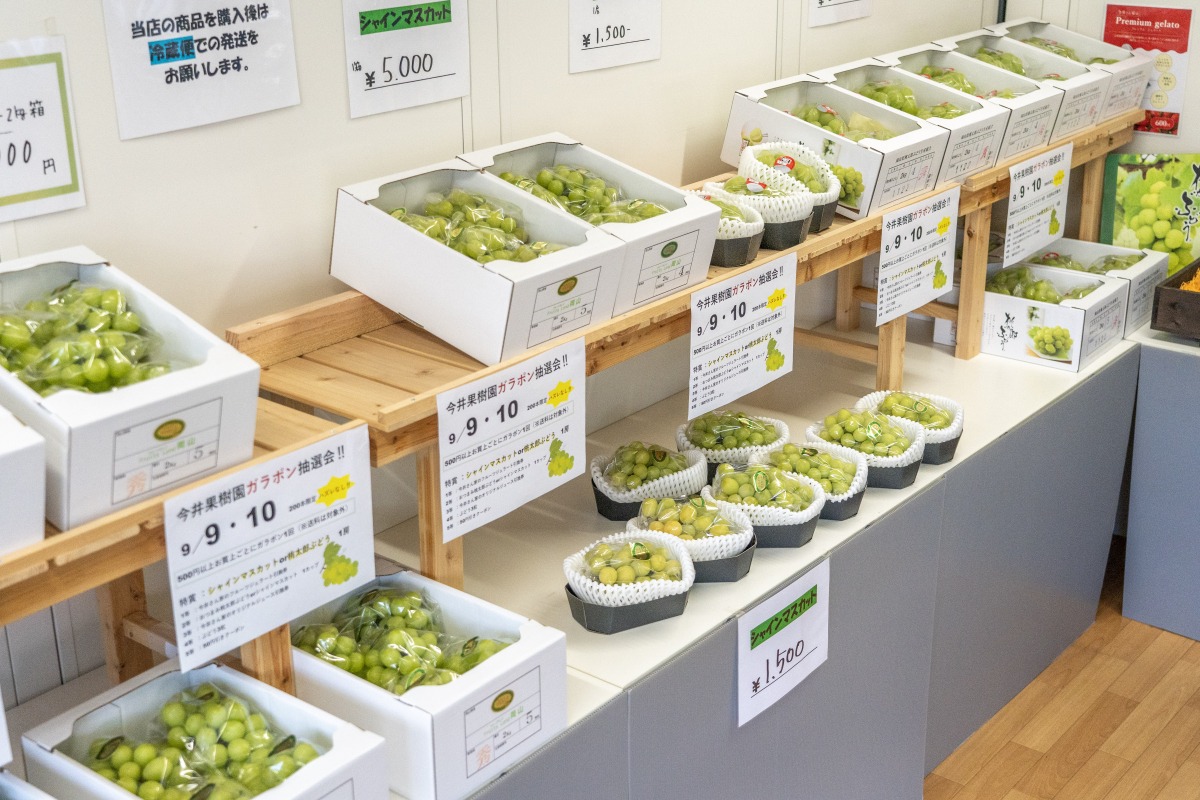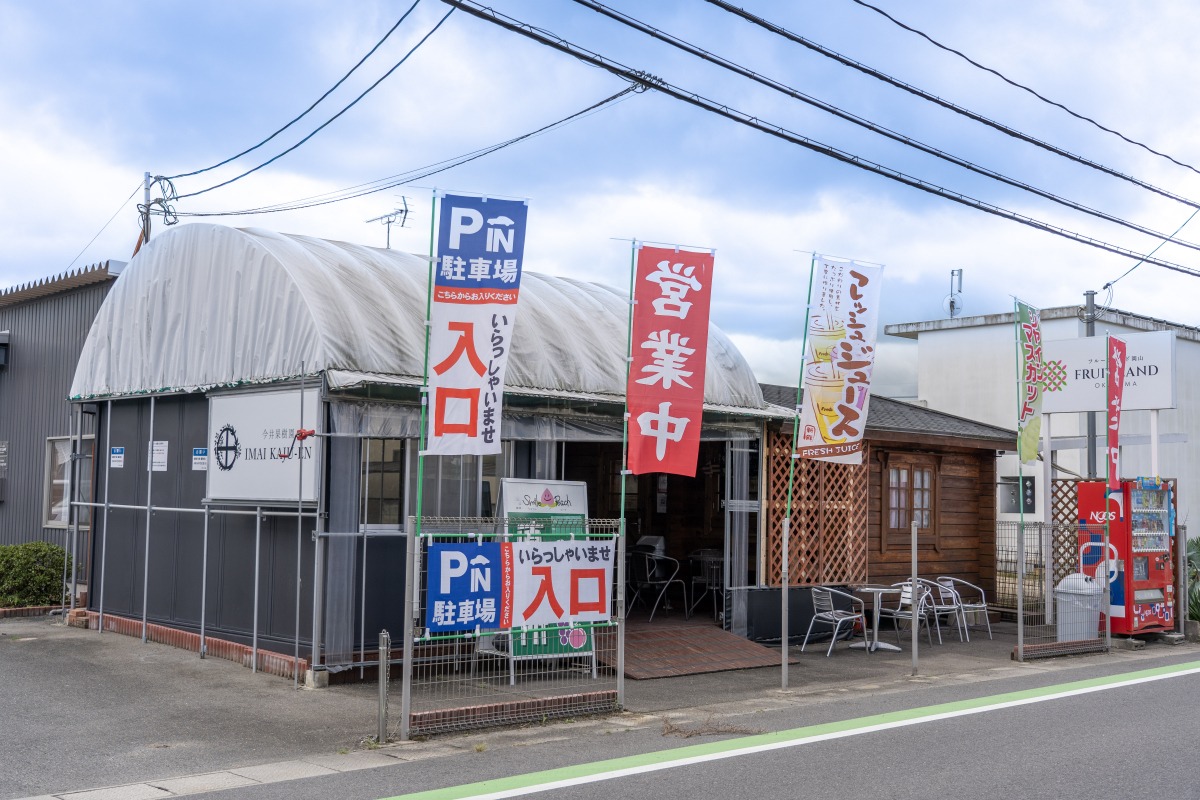 桃・ぶどうの産地である岡山市一宮地区で、7代にわたって果実栽培に携わる「今井果樹園」の直売所。白桃をはじめ、シャインマスカット、桃太郎ぶどう、紫苑といった自社農園産のくだものを、期間限定で販売しています。リーズナブルな家庭用のほか、贈答用商品もあり。直売所にはフレッシュジュースやフレッシュソーダ、フルーツジェラートなどが楽しめるカフェも併設しています。