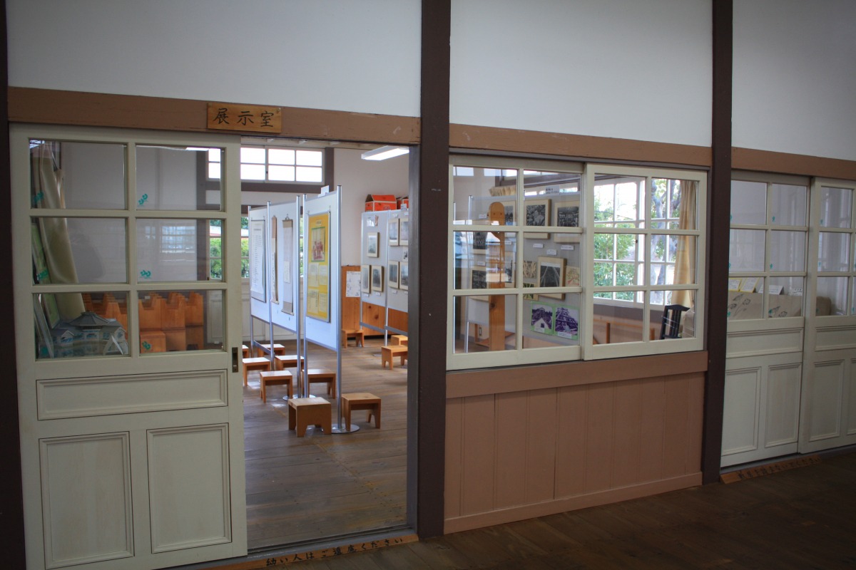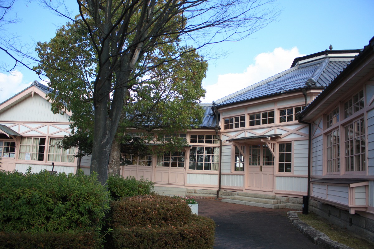 明治41年(1908)に竣工。設計は岡山県工師江川三郎八。木造平屋建、中央に八角形の遊戯室、その四方に保育室が取り付く梅鉢型平面となっています。幼稚園舎として全国で初めての重文指定を受けました。