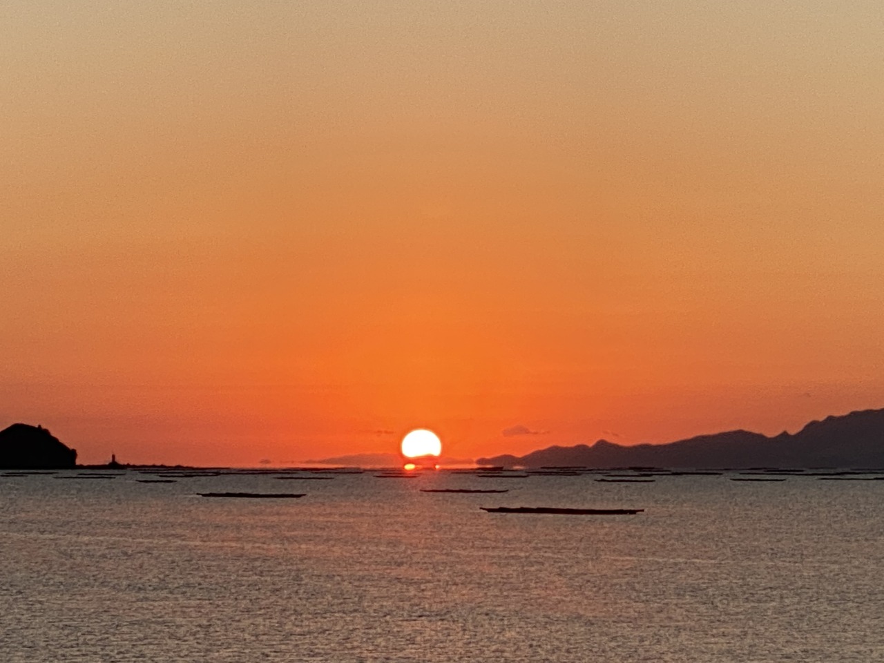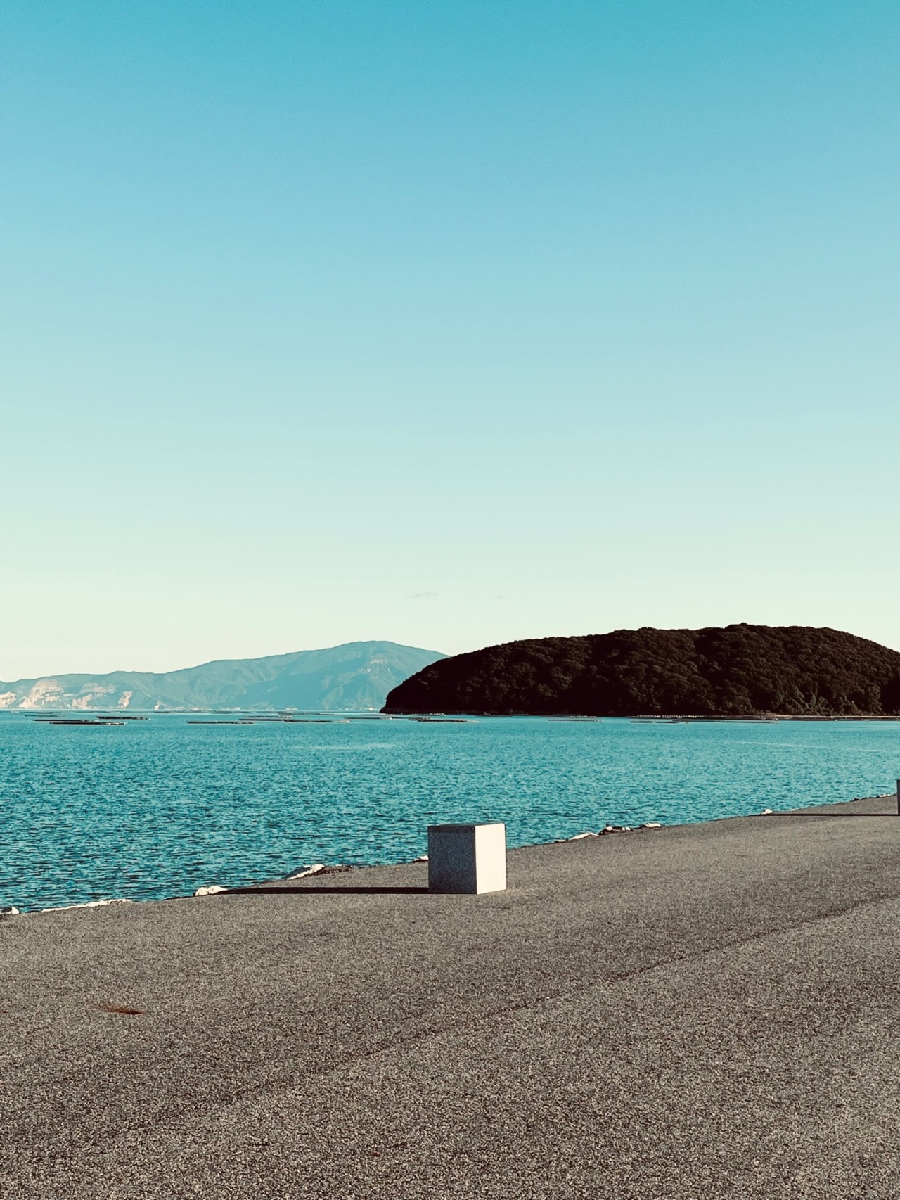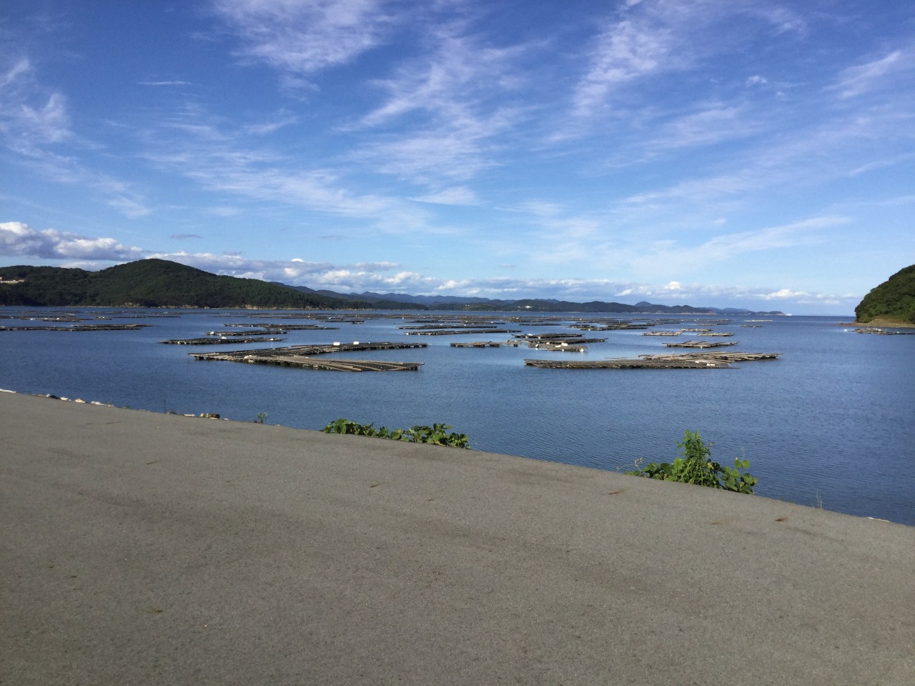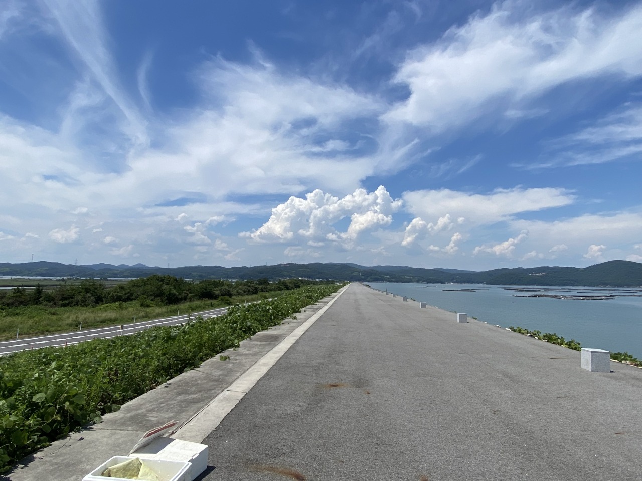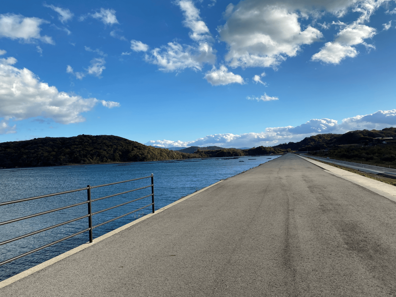 約2kmの直線で、堤防東側には牡蠣筏が浮かぶ景色と西側には湿地帯やメガソーラーの景観が広がっています。