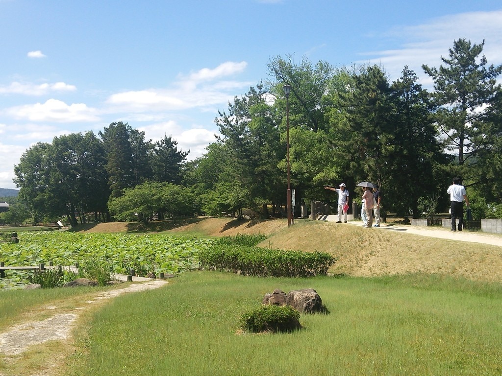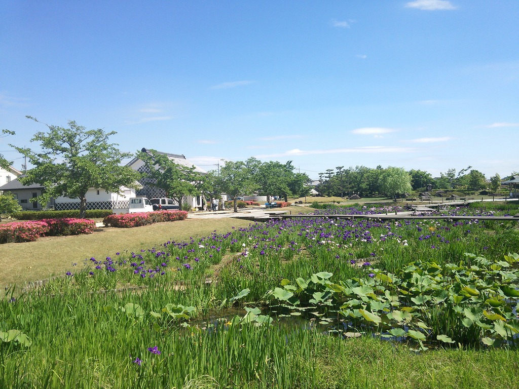 天正10年(1582)、この地で秀吉軍と毛利軍が戦った「高松城水攻め」がありました。近くには水攻め築堤跡が残っています。現在は公園として整備され、当時に思いを馳せながら散策を楽しむことができます。公園の中央にある7,000平方メートルもの広大な堀には、毎年7月中旬になると蓮「宗治蓮」が約4,000平方メートルにわたって咲く姿が見られます。