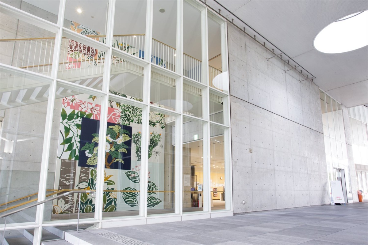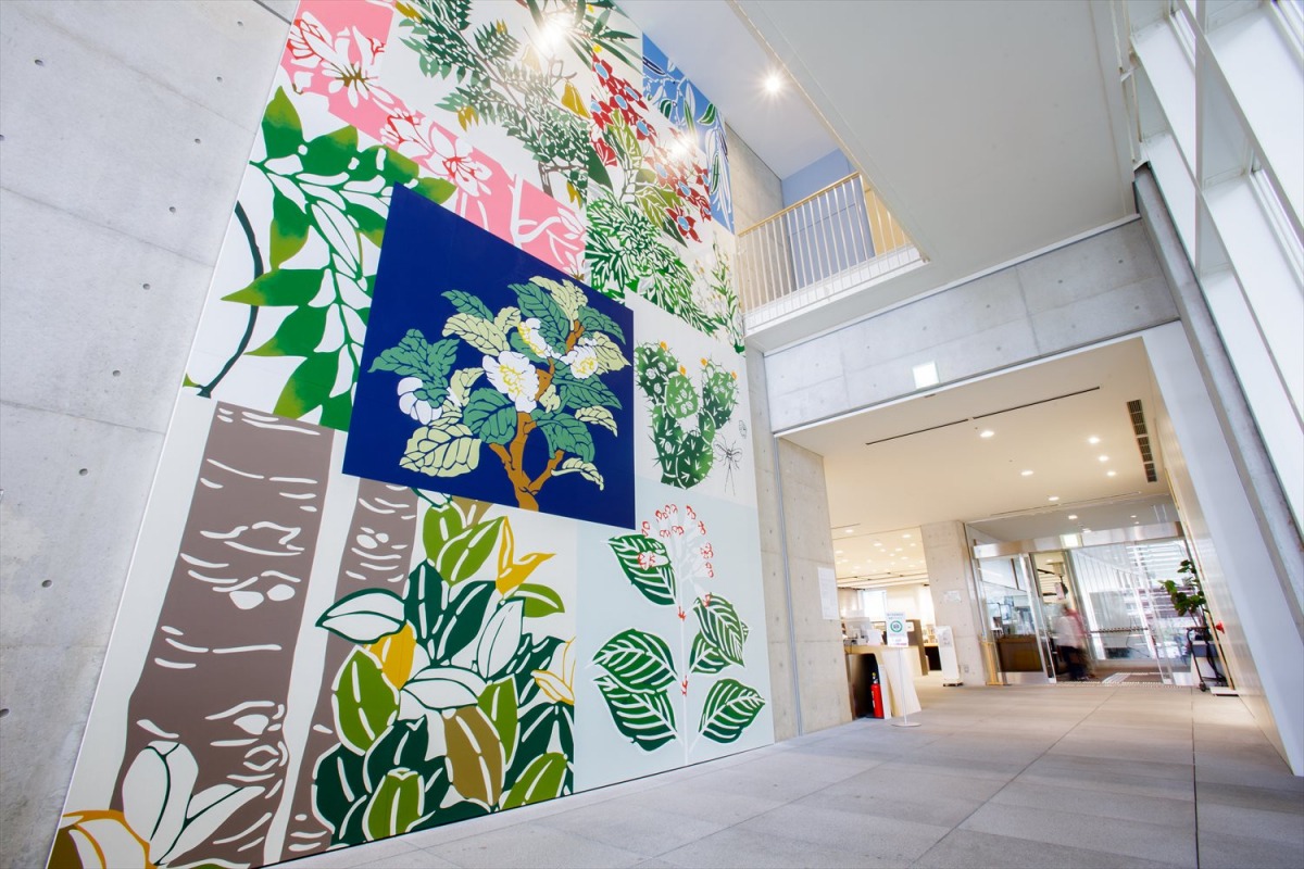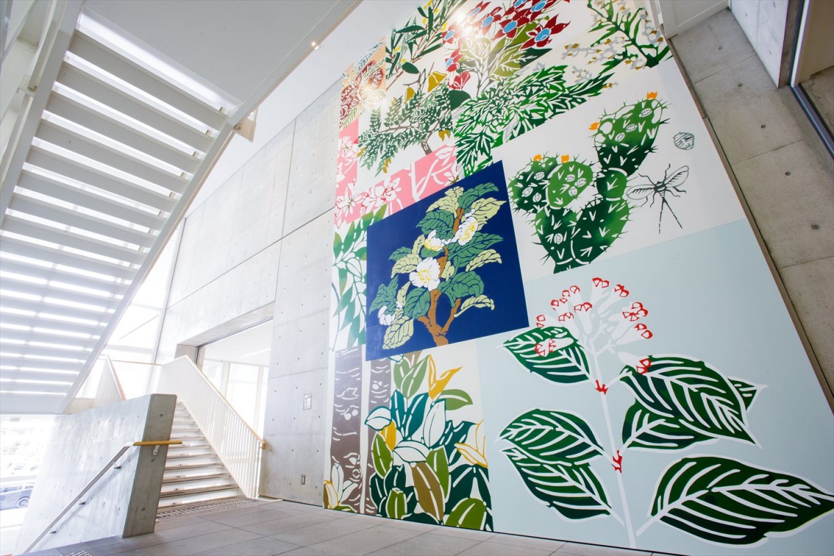 新見市立中央図書館の2階から3階へと続く踊り場の吹き抜け空間に巨大なペインティング作品「スタンダードカラー 2024」は、第1回の「森の芸術祭 晴れの国・岡山」で生まれたものです。マイケル・リン氏が新見市でのリサーチ中に訪れた呉服店で、店主に見せてもらった草木染染色図鑑(栗山工房 2代目栗山吉三郎作)から着想を得た作品です。