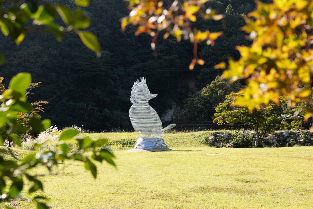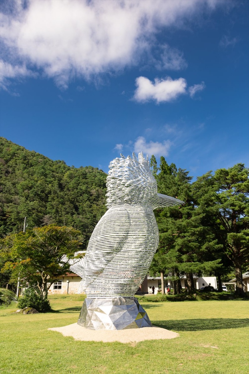 自然豊かな鏡野町を象徴するヤマセミをモチーフとした高さ6.5mにもおよぶ台湾出身のアーティストのジェンチョン・リョウの大型彫刻作品。第1回の「森の芸術祭 晴れの国・岡山」で生まれたものです。山間部の渓流に生息するヤマセミは鏡野町のシンボルとして町の鳥に指定されており、鏡野町(旧富村一円)はヤマセミの生息地として、岡山県指定の天然記念物になっています。