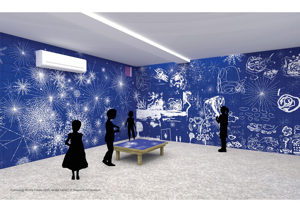 2025年9月上旬頃から奈義町立図書館に設置される「未来のための宇宙論」は、サンドラ・シント氏と奈義町の子供たちと共同で新作の壁画が制作されました。第1回の「森の芸術祭 晴れの国・岡山」で生まれたものです。図書館の利用時間内であれば、どなたでも観賞することができます。