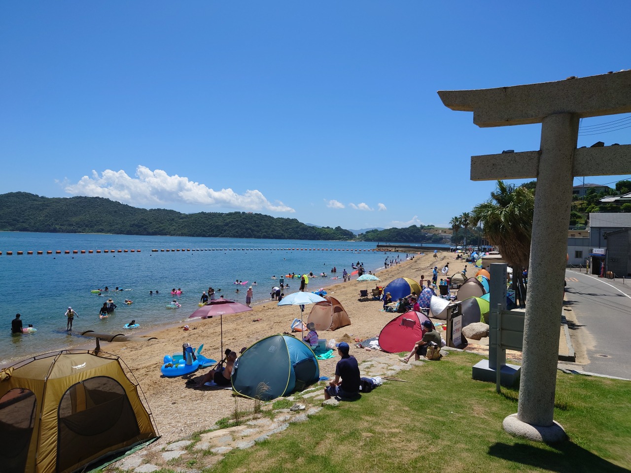 広くゆったりとした、前島を望む瀬戸内海の穏やかな浜は家族連れに人気のスポットです。