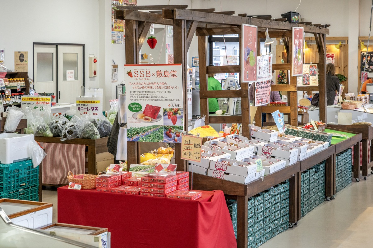 岡山フルーツ農園産の果物をはじめ、契約農家が丹精込めて作った朝穫れの野菜やくだものが並んでいます。その他、パンや地元でとれた魚介、全国の漁港直送の新鮮な魚もあり。西大寺エリアのみで栽培されているいちご「皆足姫」が買えるのはここだけ!
