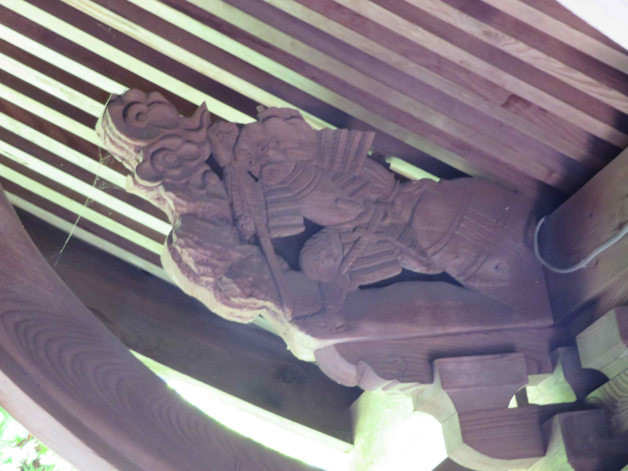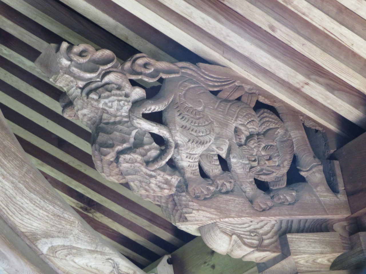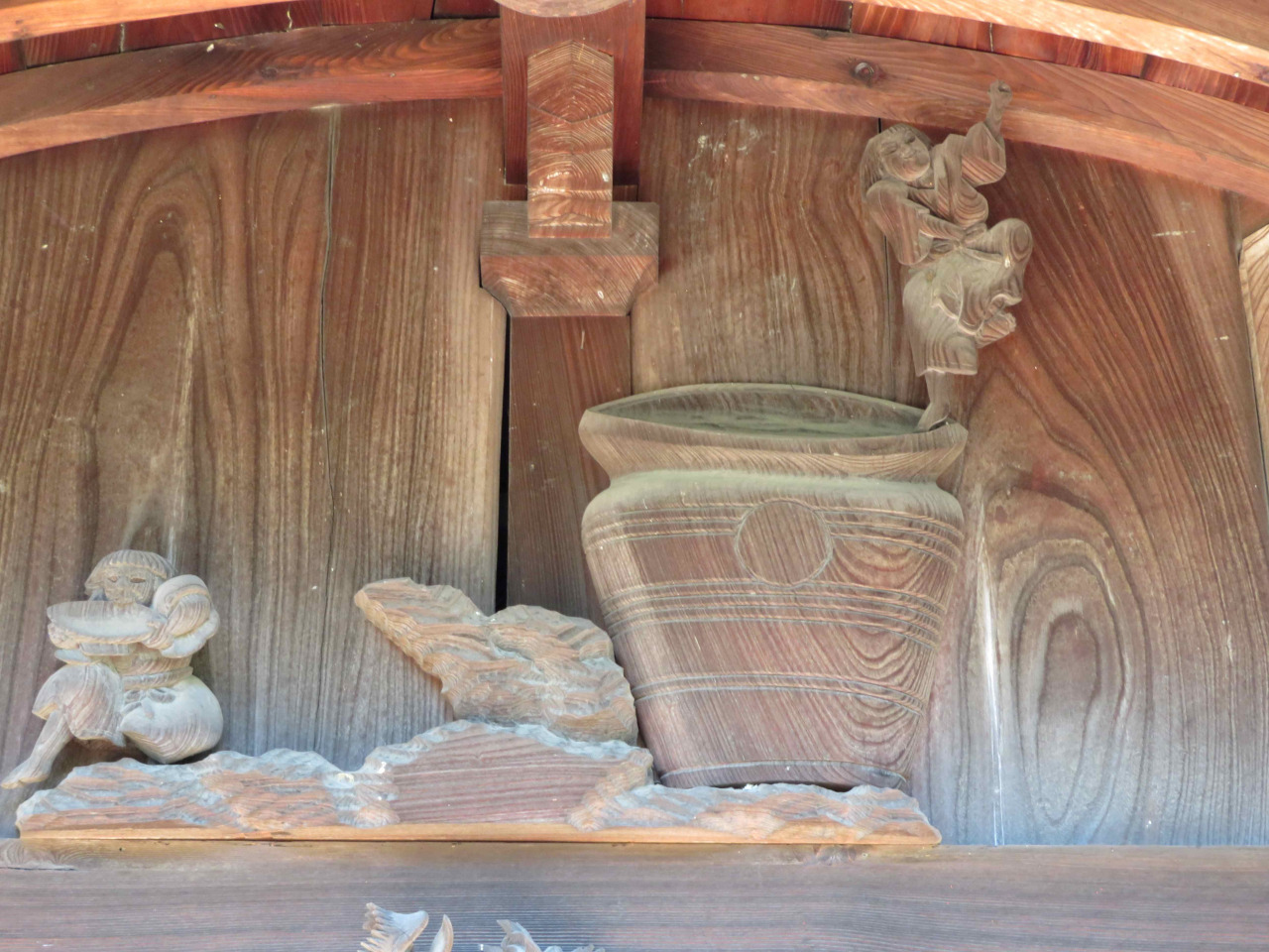 木の彫刻:獅子と獏、雲に龍、戦勝祝いの酒宴模様(酒飲み男と酒樽にのって踊る女)、龍、鳳凰、甲冑の武士、虎、他