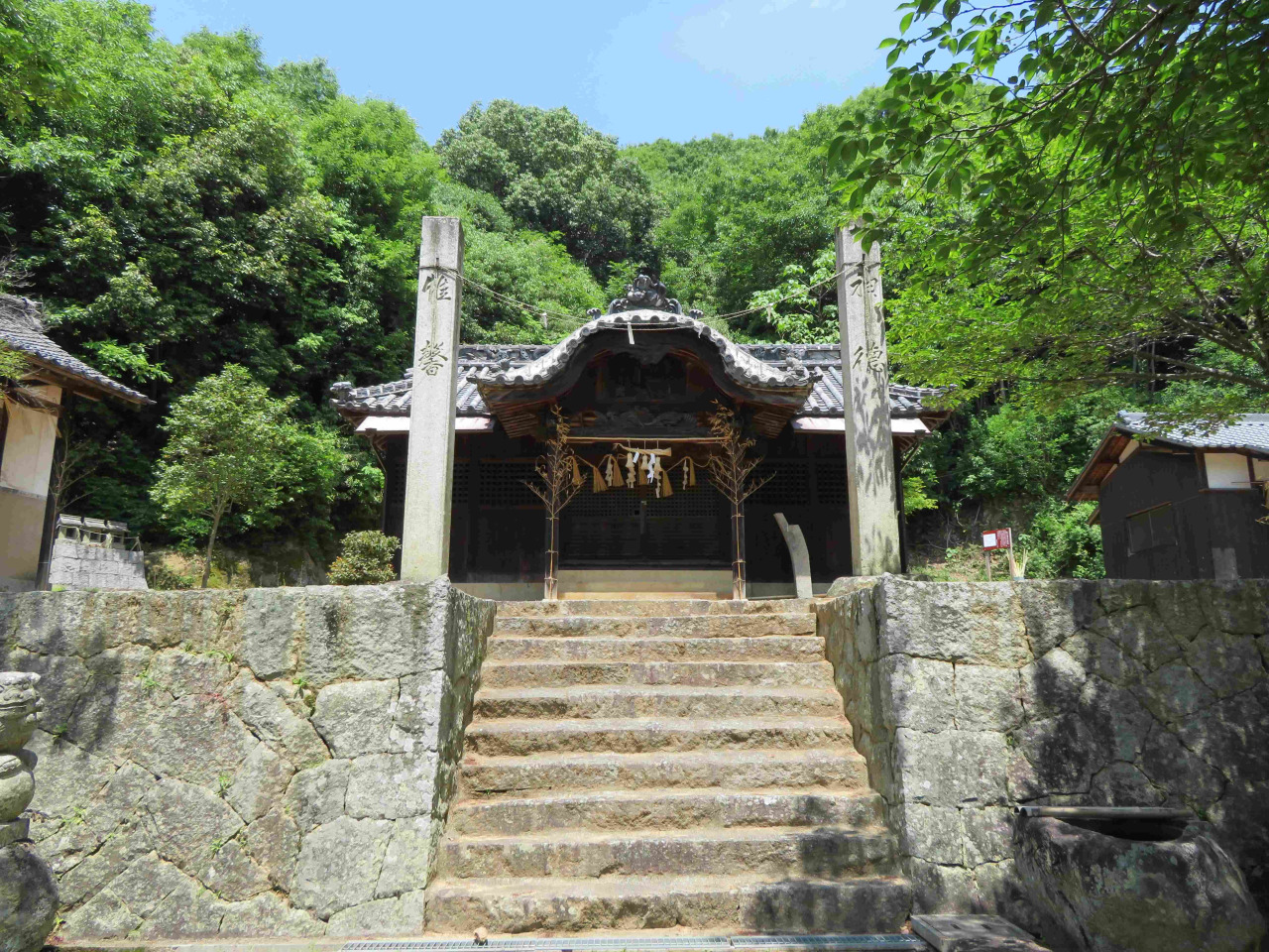 南北朝時代の1351年(正平6年)5月5日の創建で備中杉山城の守護神です。杉山山頂には杉山城の主郭と軍神社がありましたが、のちに軍神社は杉山麓に奉遷され、1909年(明治42年)頃に再建されました。奥の院は奉遷の頃に杉山山頂に創建されたようです。神様は二人で、①武甕槌神 (たけみかづちのかみ)、御利益は武道守護、武道上達、国家鎮護、航海平安、安産守護、病気治癒、厄除開運、延命長寿、縁結び、交通安全、農業守護と、②経津主命(ふつぬしのみこと)、御利益は武芸上達、開運招福、諸災厄除け、地震除け、延命長寿、交通安全、夫婦和合、出世、憑物払い、安産、殖産興業、農耕・海上守護です。神社の屋根瓦や木の彫刻飾りでは、昔話やおとぎ話の世界が楽しめます。