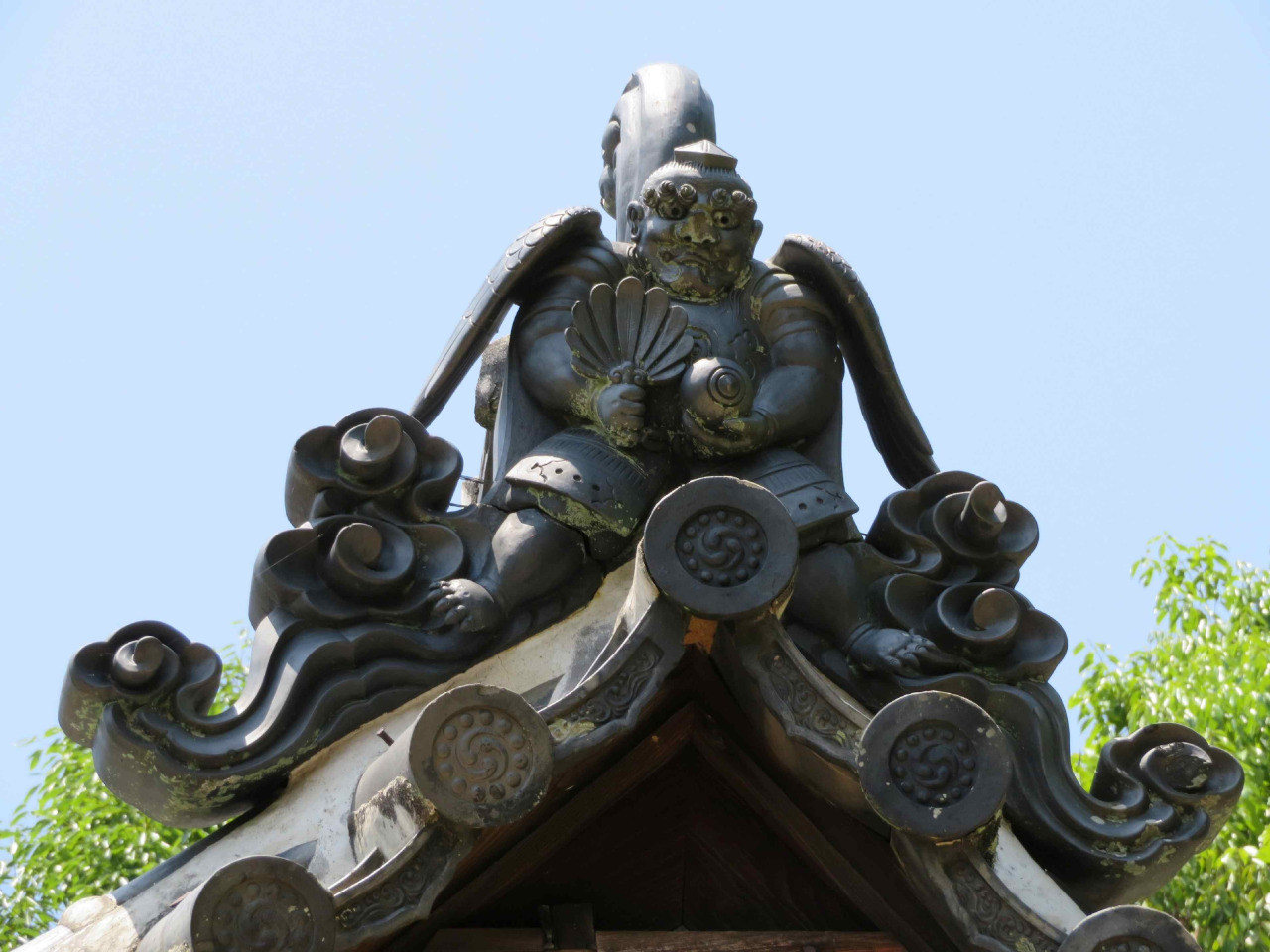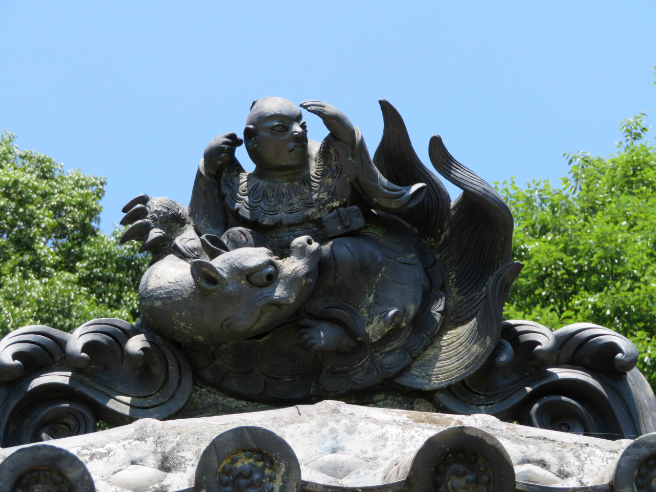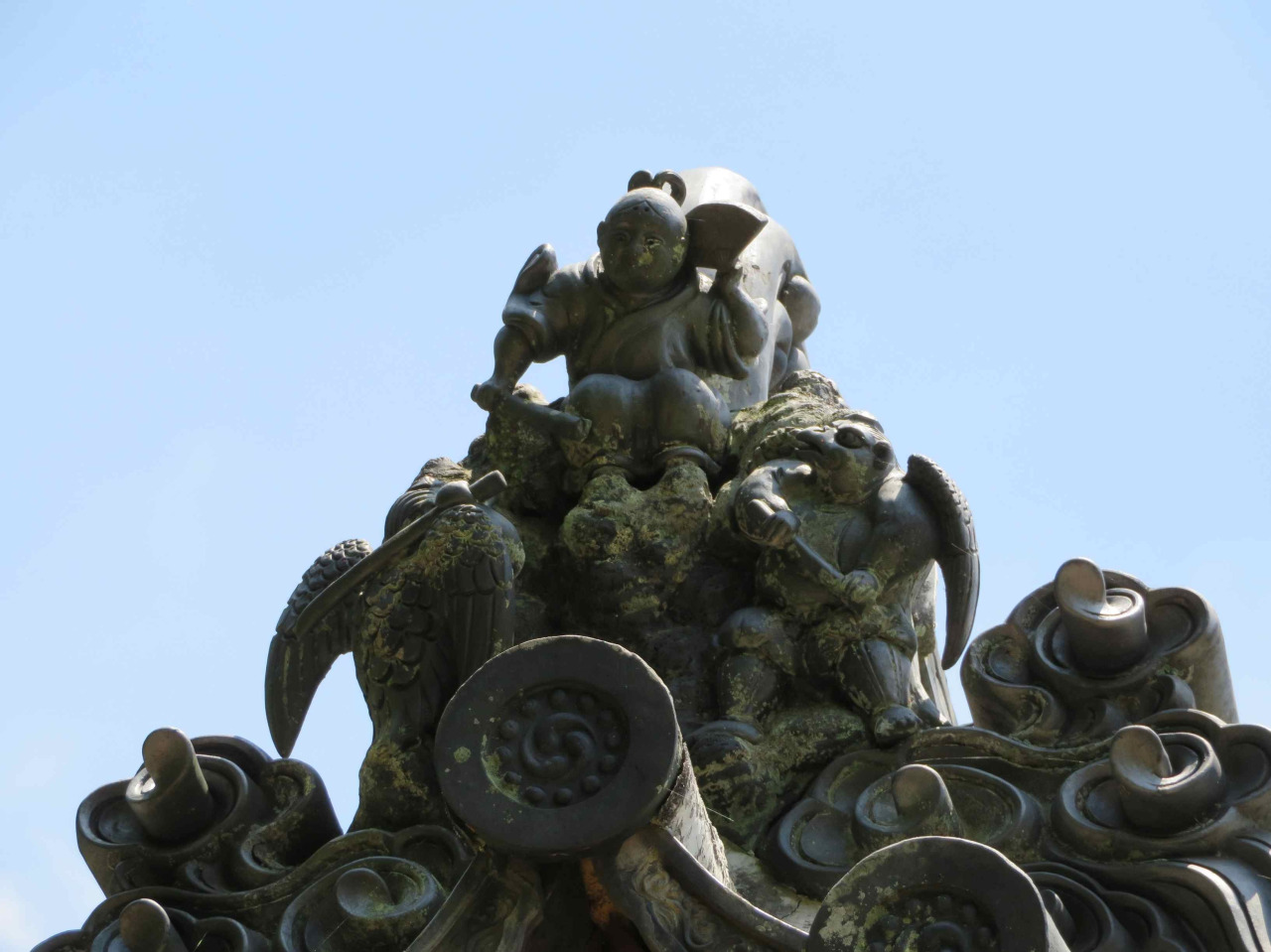 神社の屋根瓦や木の彫刻飾りでは昔話やおとぎ話の世界が楽しめます