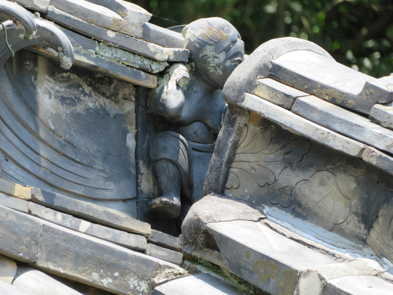 屋根瓦:浦島太郎と亀、牛若丸と烏天狗、鉞かついだ金太郎、天狗、龍、オシドリ、軍文字、獅子と獏、ハート(猪の目)、おしどり、他