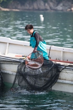 北木島の港から漁船に乗り牡蠣筏に行き、実際に牡蠣がどのように育てられているか船の上から見学。漁師さんによる生産方法や牡蠣の解説の後は、生牡蠣の試食、牡蠣を使用したオイスタースタウトや日本酒の試飲ができます。