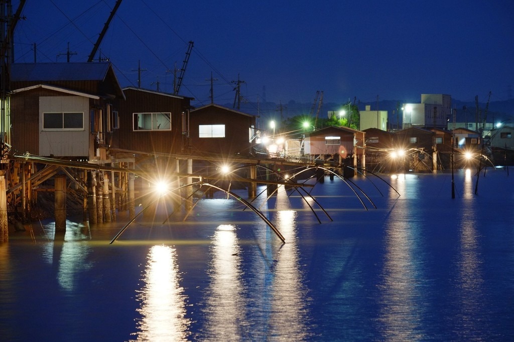 四つ手網とは約5~6m四方の網が設置された小屋で、巨大網を使って魚を獲る漁のスタイル。夕方から翌日のお昼頃まで小屋に滞在。夜の暗闇の中、部屋の明かりに誘われて寄ってきた魚たちを巨大網ですくい上げます。小屋には調理台、冷蔵庫、鍋、食器などが揃っているので獲れたての魚をすぐに調理して食べられます。春から秋にかけてが漁のシーズン!仲間や家族と一緒におもしろ釣り体験をしてみては!
