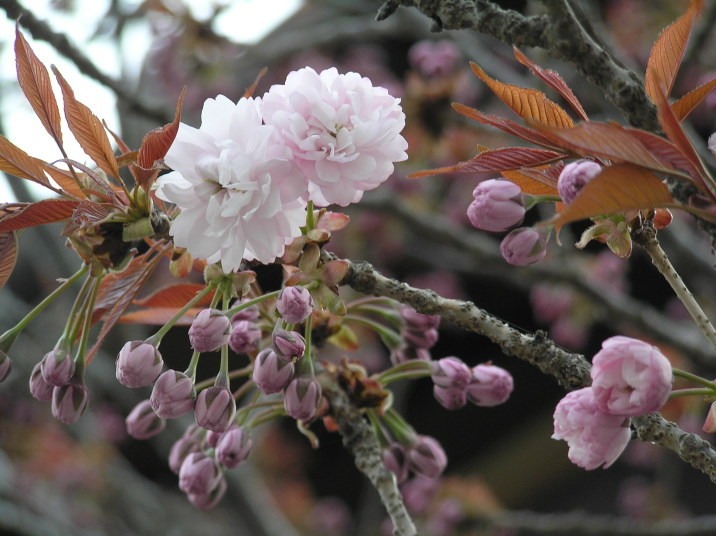 八重桜の一種で、花びらが60枚あり、花びらの内側の20枚ほどが内に向かってカール状になっています。このため、花びらが膨らんでいます。他に類を見ない名花として岡山県の天然記念物に指定されています。